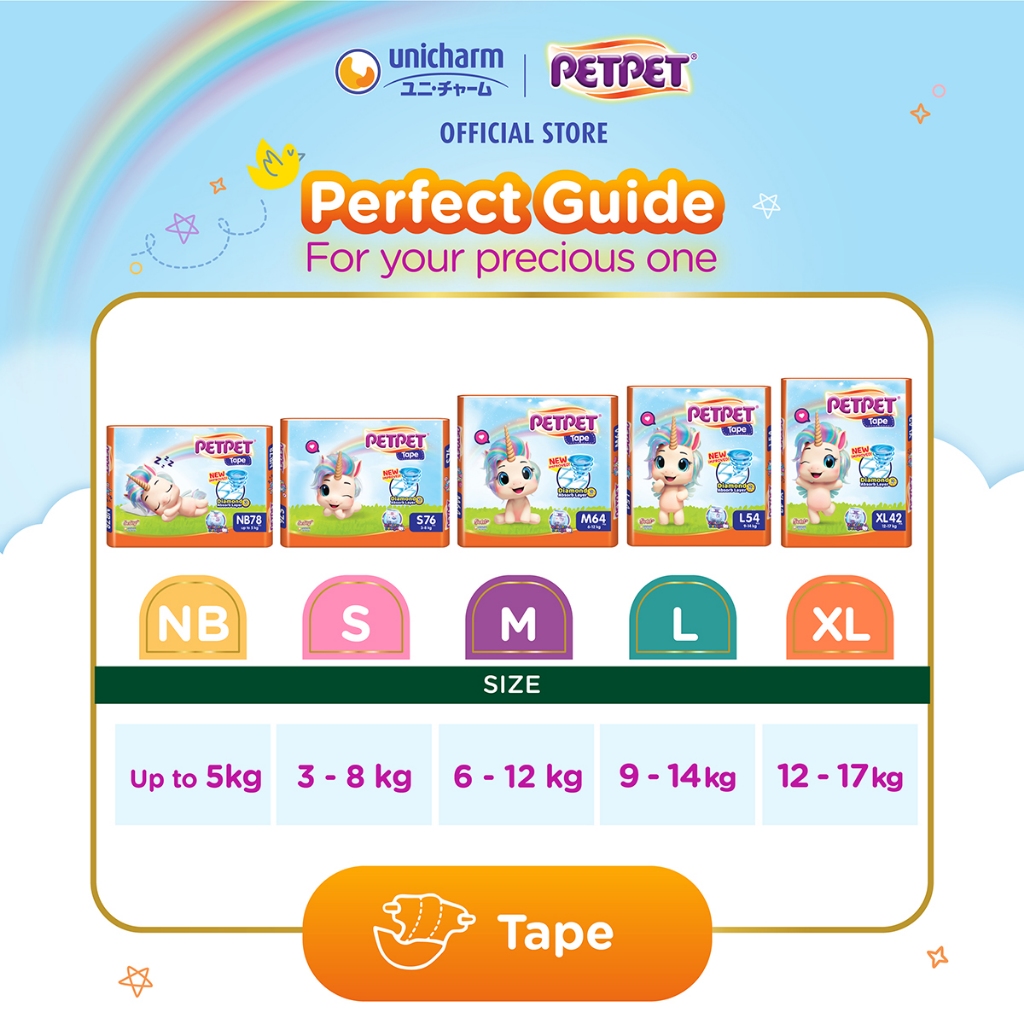 PETPET Unicorn Softy+ Tape Baby Diapers NB60 (1 Pack) (Up to 5kg)