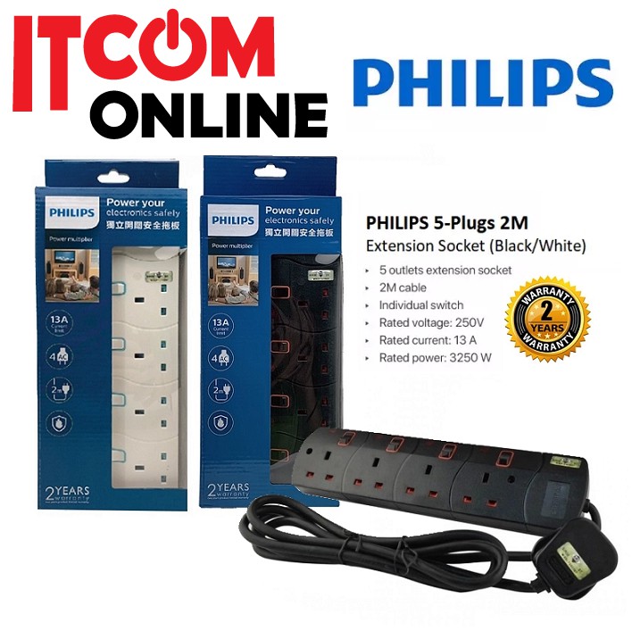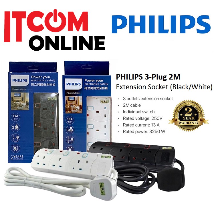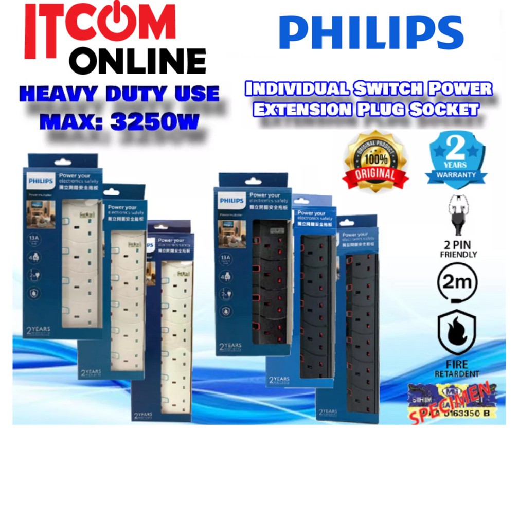 PHILIPS 3/4/5/6 GANG PLUG WAY BLACK WHITE HEAVY DUTY EXTENSION SOCKET 2 METER SIRIM CERTIFIED (SPN1634)(SPN1644)(SPN1654