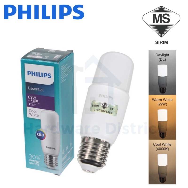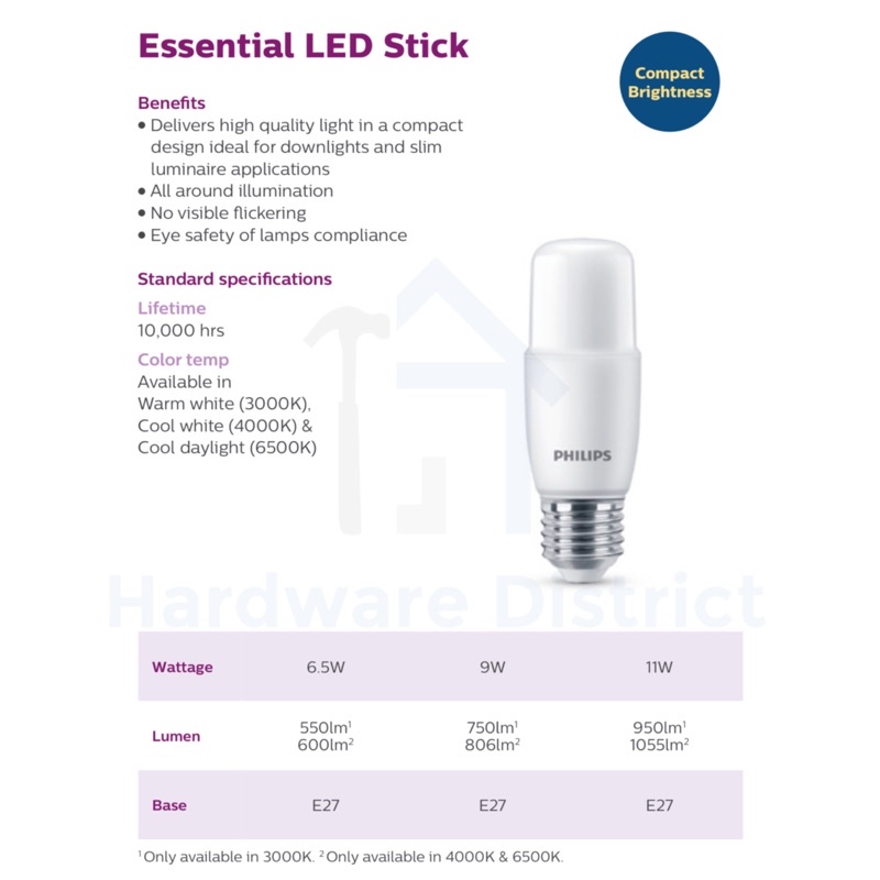 PHILIPS ESSENTIAL LED STICK E27 6.5W/9W/11W | 6500K DAYLIGHT / 4000K COOL WHITE / 3000K WARM WHITE
