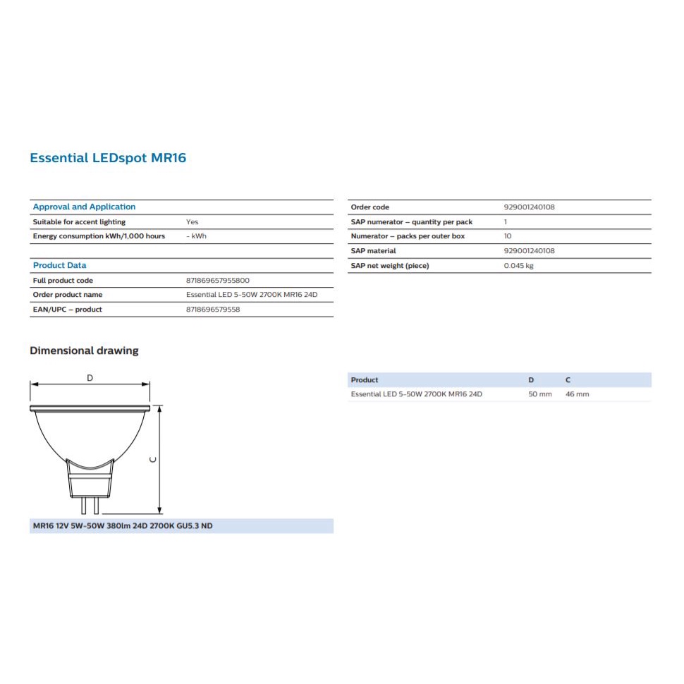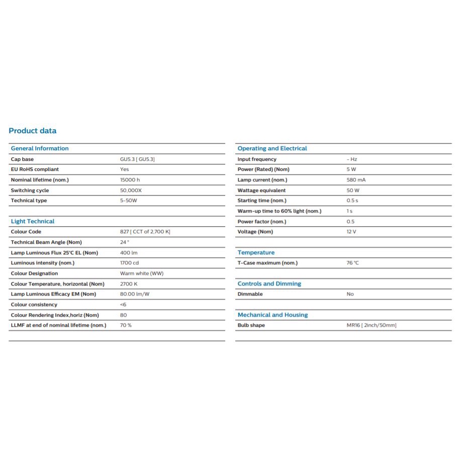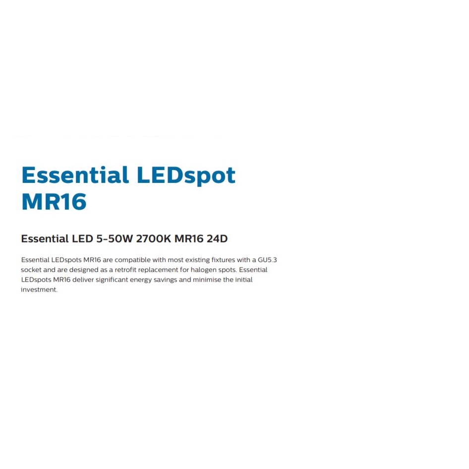 PHILIPS ESSENTIAL MR16 5W 12V 24D NON DIMMABLE LED SPOTLIGHT BULB [2700K/6500K] LED DRIVER REQUIRED