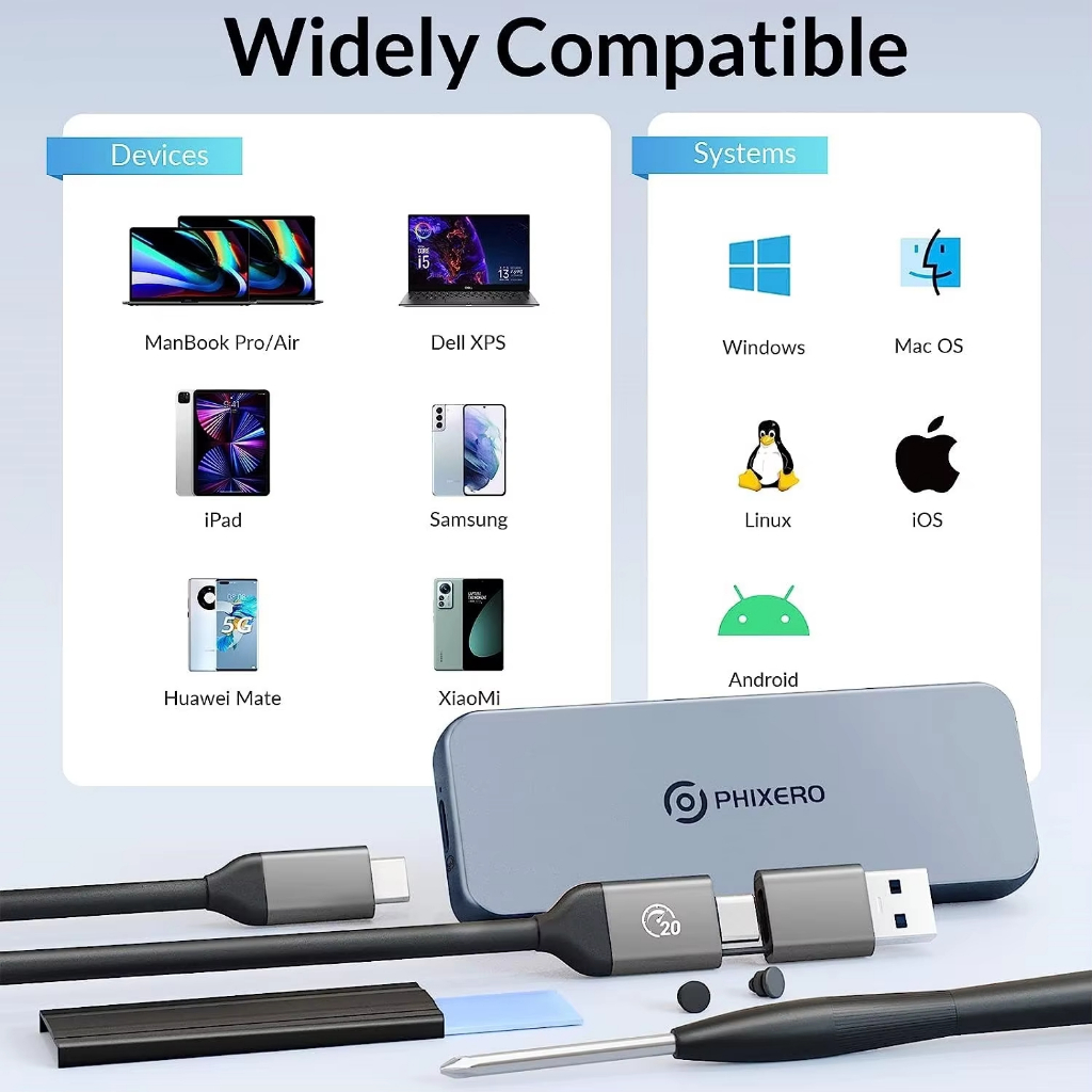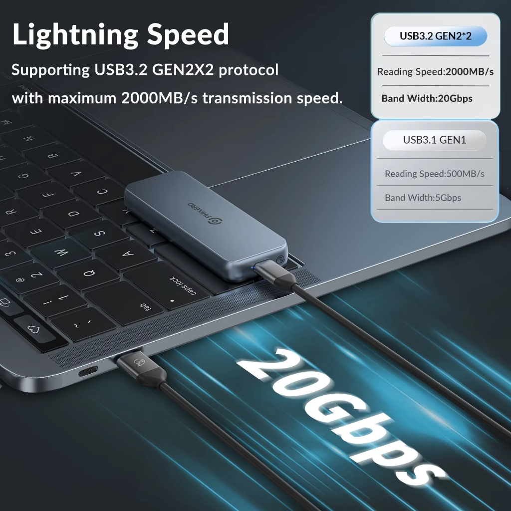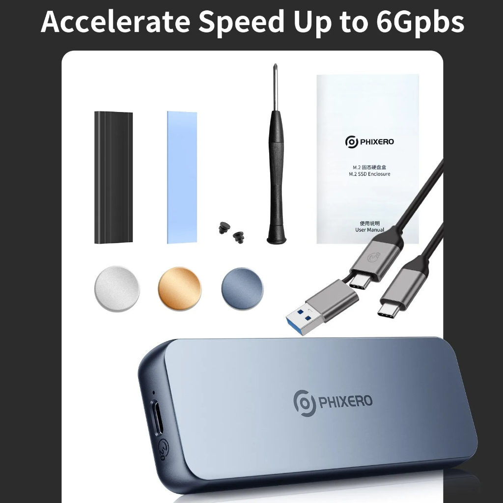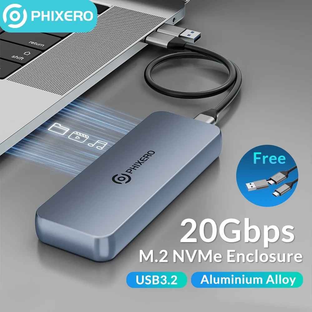 PHIXERO M.2 NVMe / SATA SSD Enclosure Dual Protocol Hard Disk Enclosure Adapter Tool Free Aluminum Case Type C USB3.2 Gen2 20Gbps to NVMe PCIe External Enclosure for M2 NVMe SSD