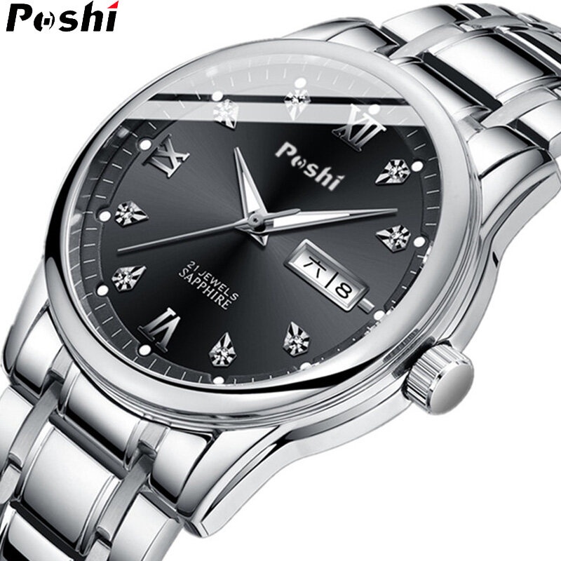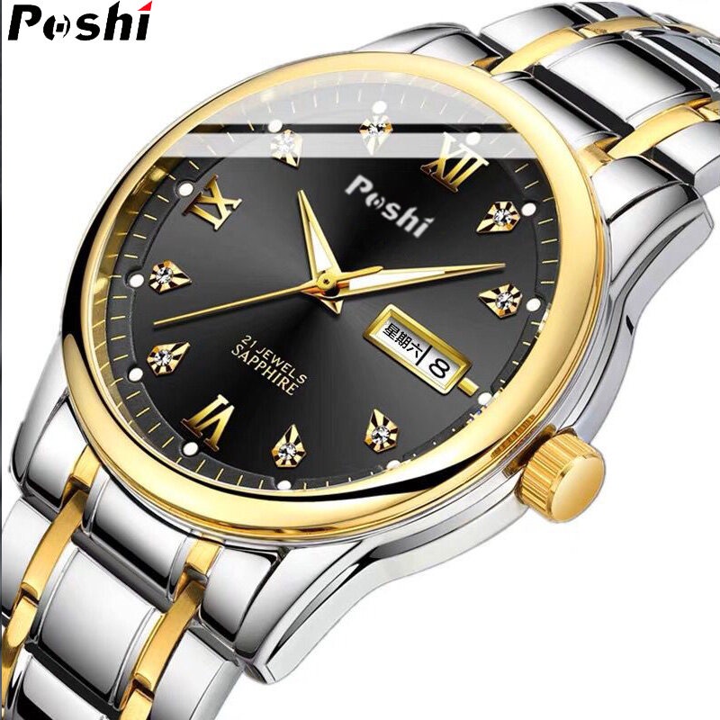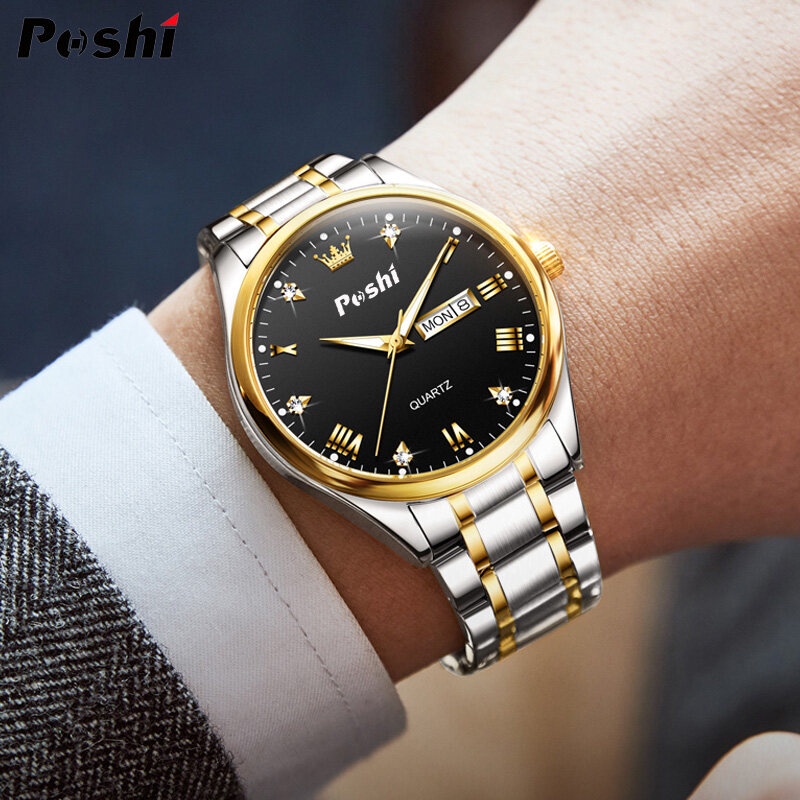 POSHI Watch For Men Water proof Original Luxury Gold Stainless Steel Quartz Watches Mens Luminous Dual Calendar