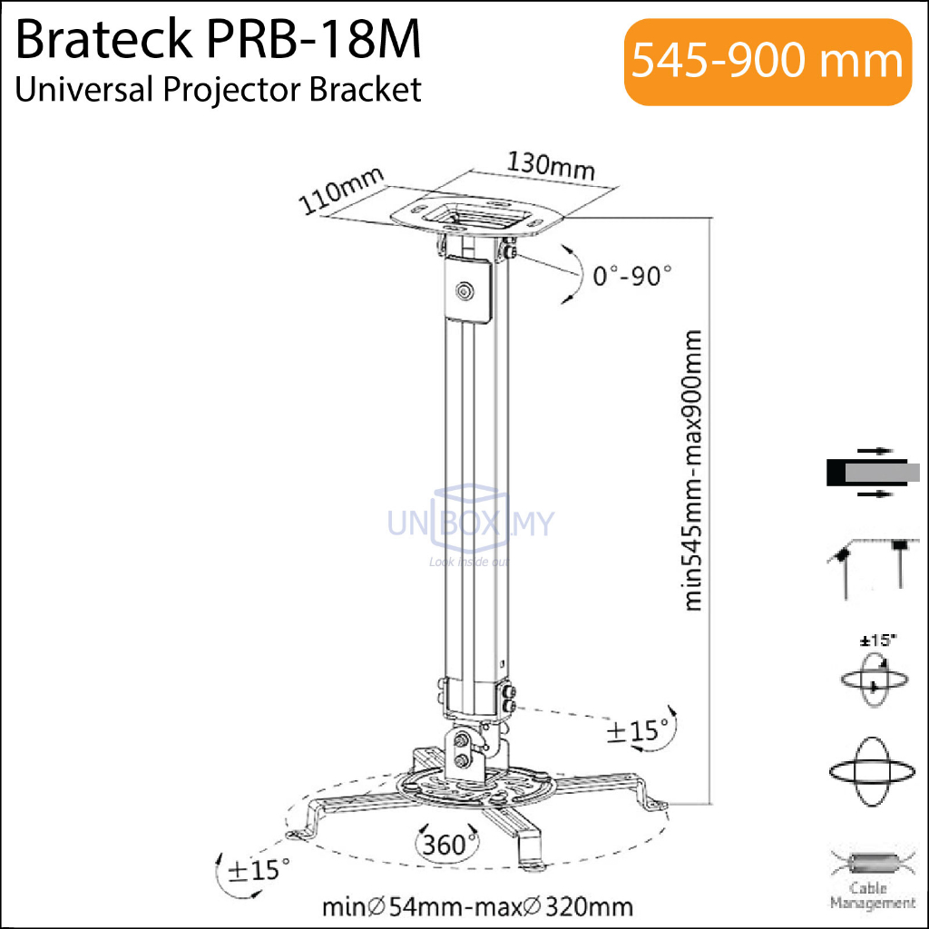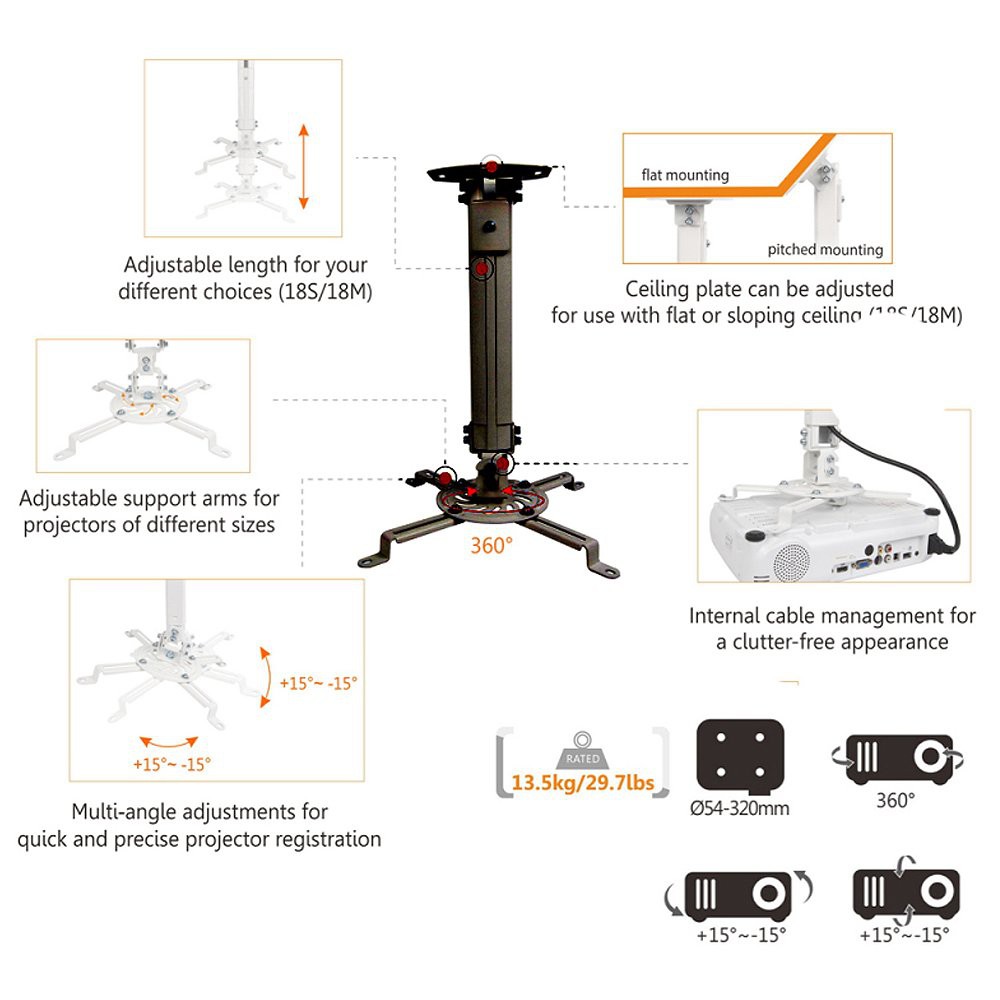PRB-18M Universal Aluminium 3ft Projector Bracket Mount Black for flat or sloping ceiling 90 degree wall install