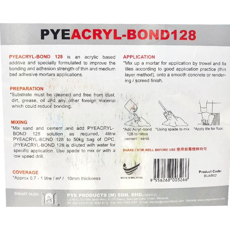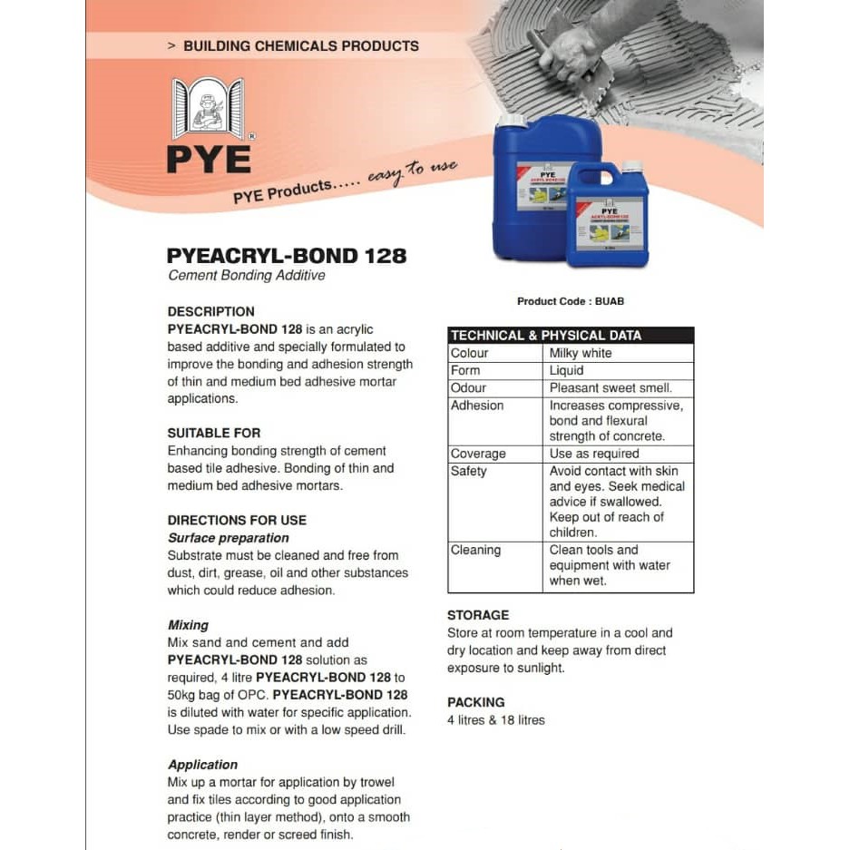 PYE ACRYL-BOND 128 4 LITRE CEMENT BONDING ADDITIVE TILE FIXING FLOOR SCREEDS / ikatan simen