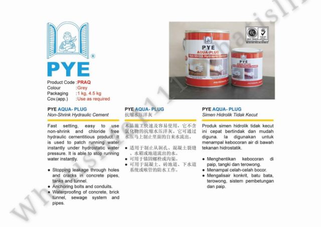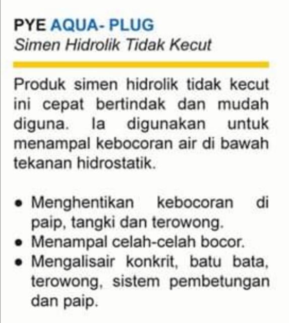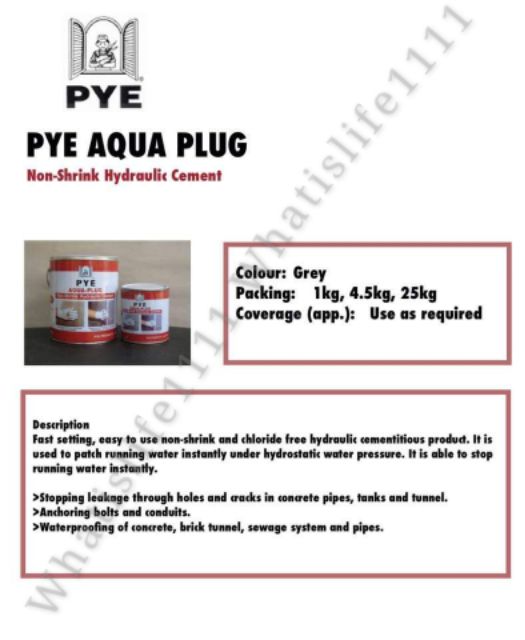 PYE AQUA PLUG 1KG NON SHRINK HYDRAULIC CEMENT WATER PLUG WATERPROOF WATER STOP ONLY WEST MALAYSIA