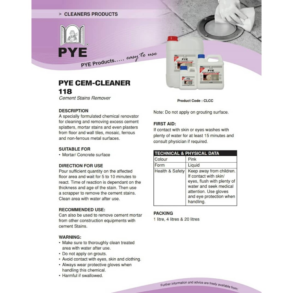 PYE CEM-CLEANER & NODAX CEMENT DISSOLVER / CEMENT STAIN REMOVER / TILE CLEANER / CEM CLEANER / MOSAIC CLEANER (118) 1LIT