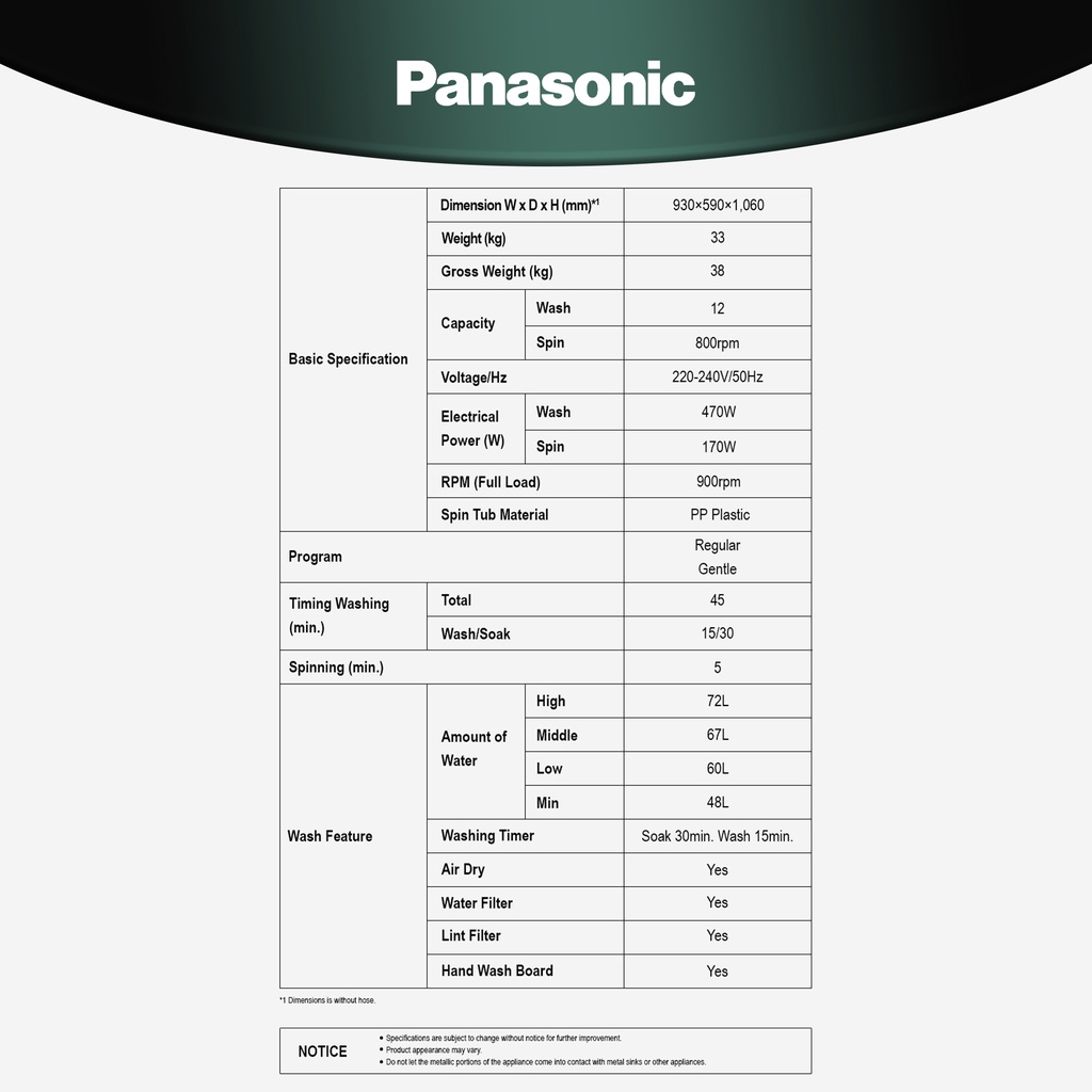 Panasonic Washer Washing Machine (12kg / 8kg) NA-W120G1VRT