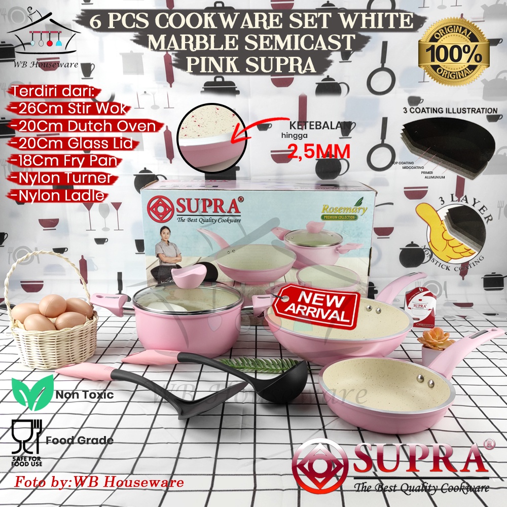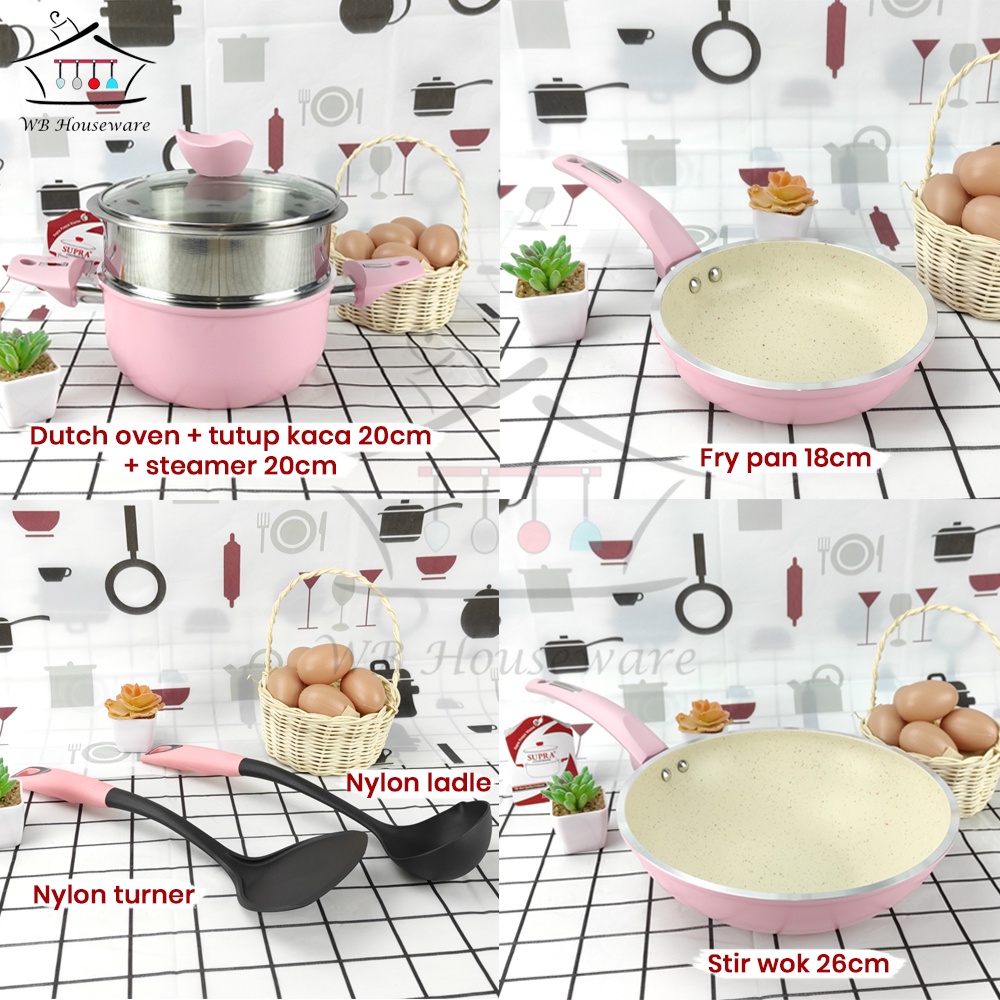 Supra 6pcs white marble pink pan set + steamer pastel series non-stick cookware set steamer pan set