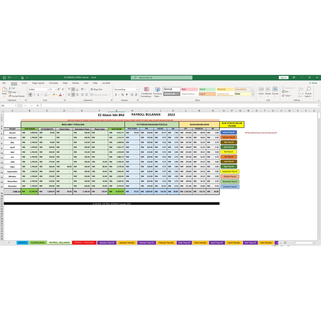 Payroll System in Excel, Kira Gaji Sistem Automatic Count Epf, Socso, PCB (simple to use)