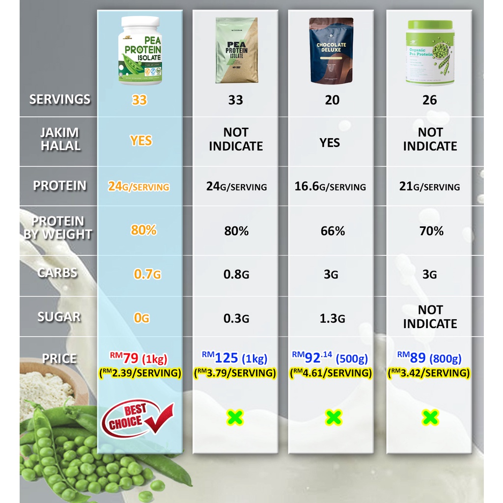 Pea Protein Isolate Halal 1kg, 33 ser(Unflavor) 80% Protein - Vegan Protein | Myprotein Shaklee ESP Soluxe Nutrilite