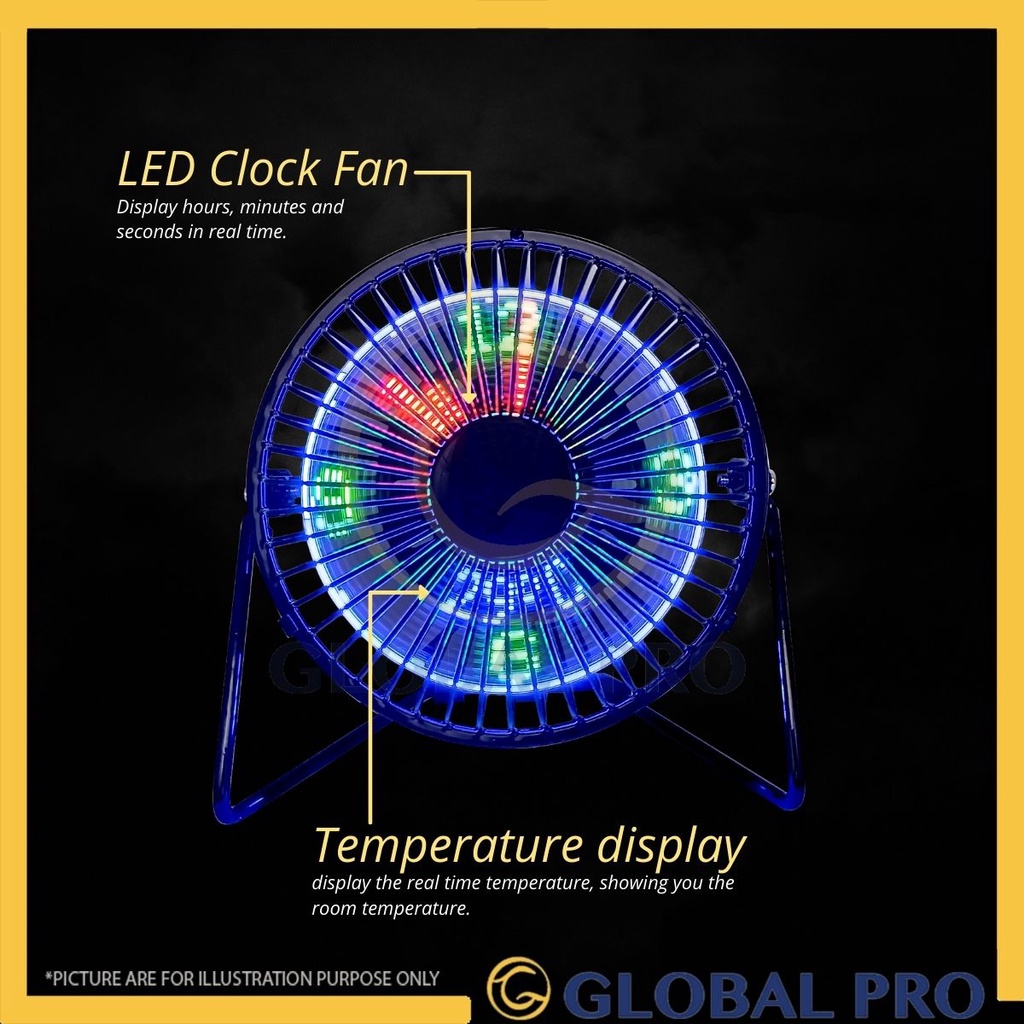 Personal Fan Small Desk USB Fan with Clock and Temperature Display, 5 Inch Metal Frame USB Powered Flashing LED Display