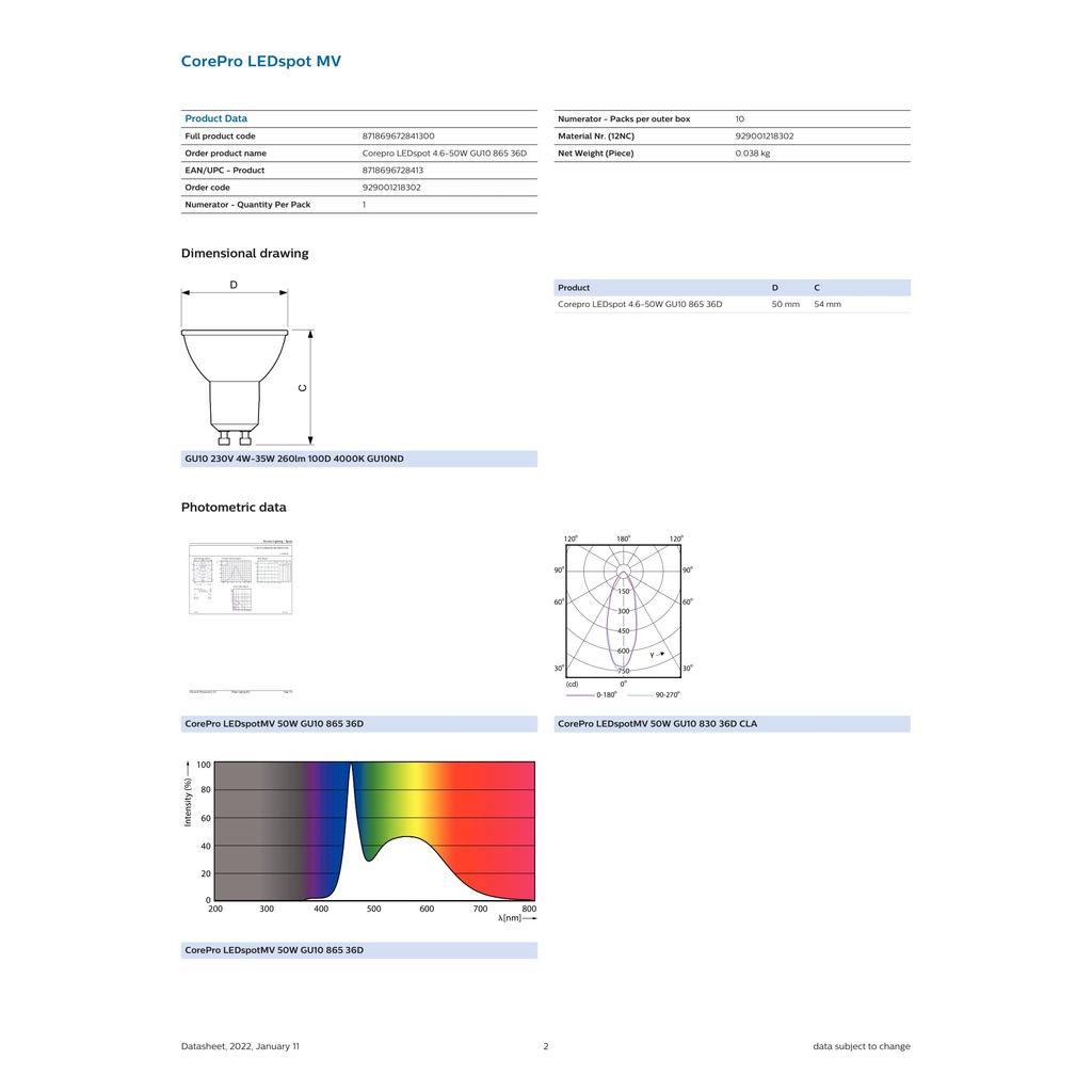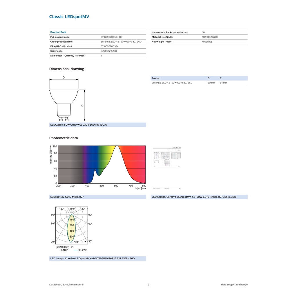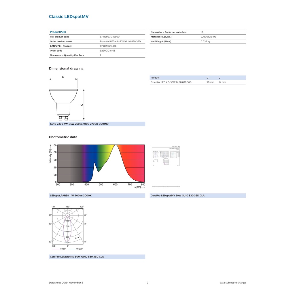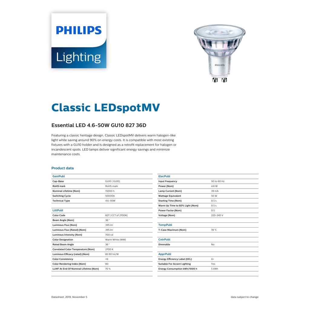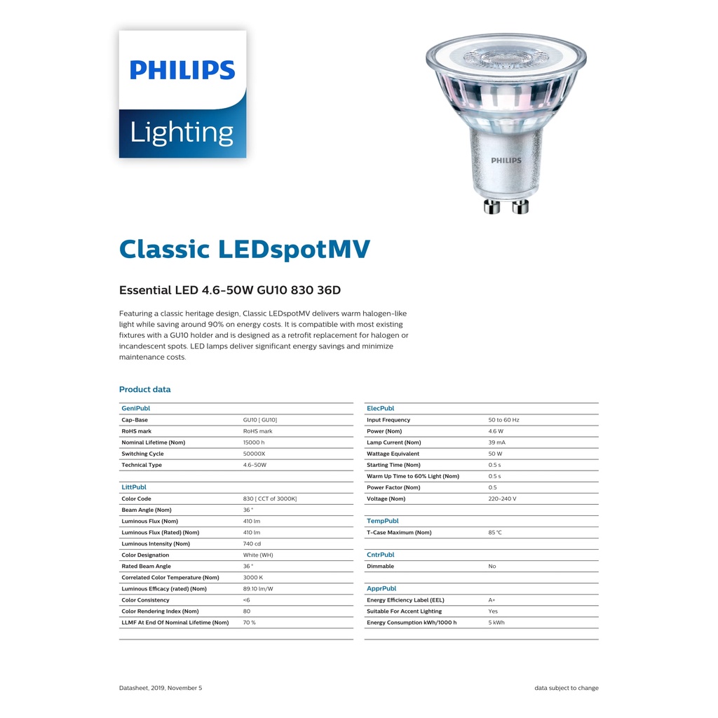 Philips Essential LED Spot GU10 4.6W 36D Non Dimmable ( 6500K / 3000K / 2700K )
