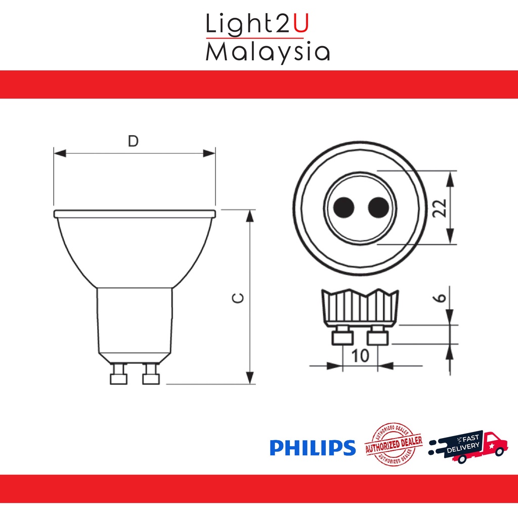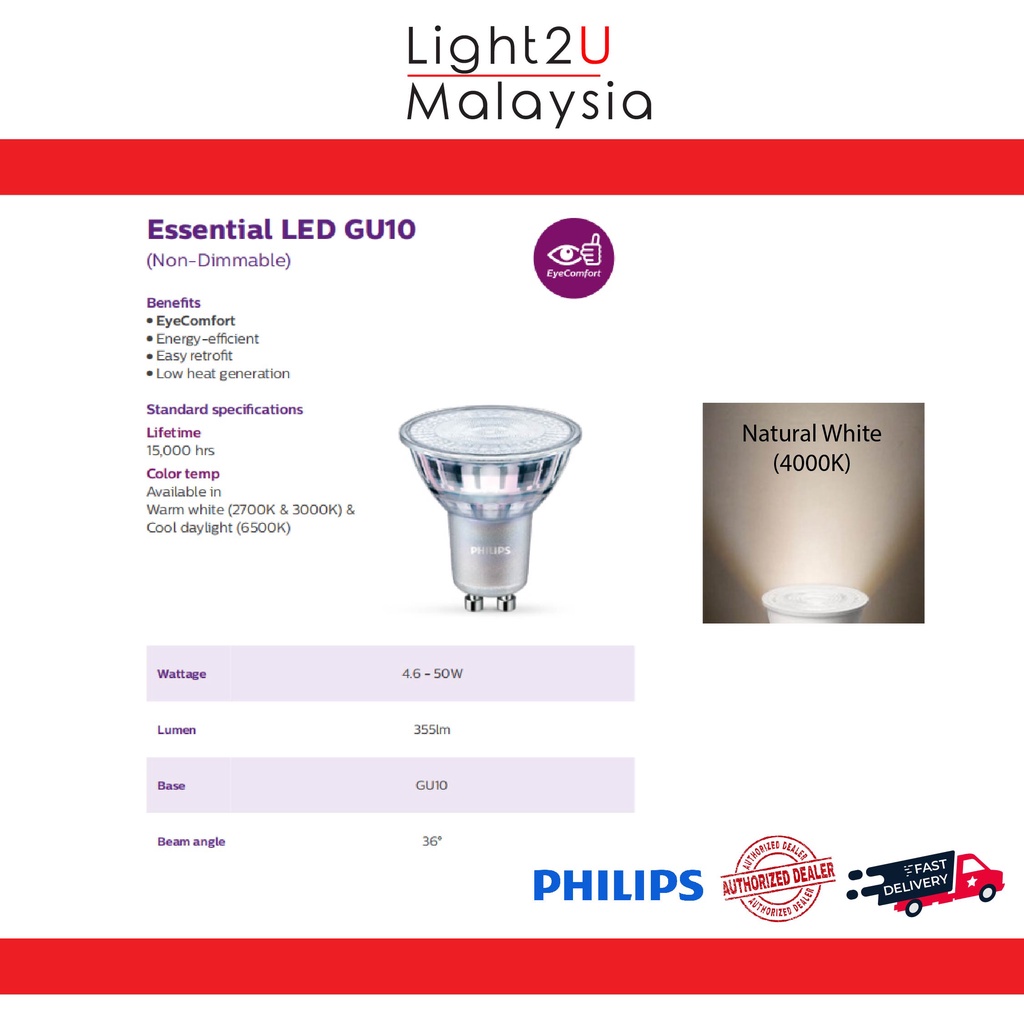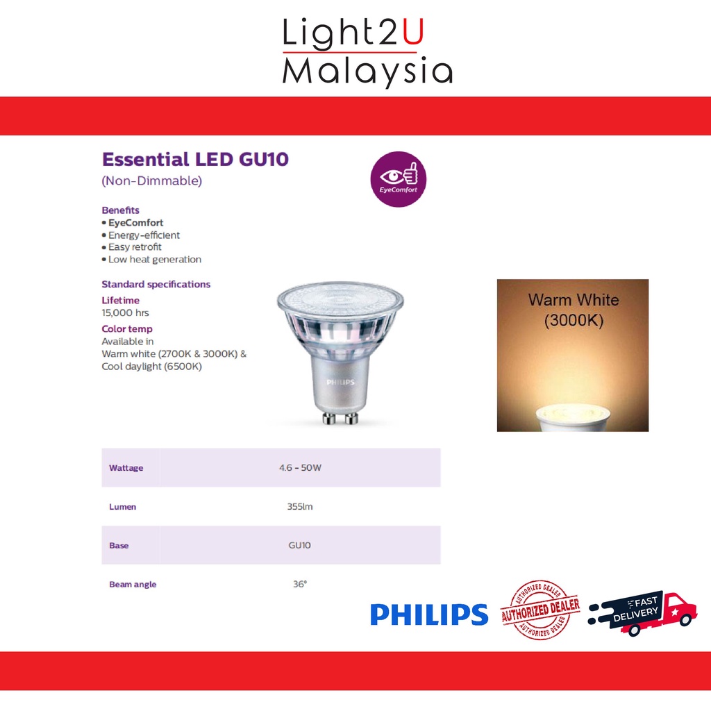 Philips Master LED 4.9/5-50W MR16 GU10 36D (Dimmable) - 3000K/4000K [Light Bulb - Mentol Lampu]