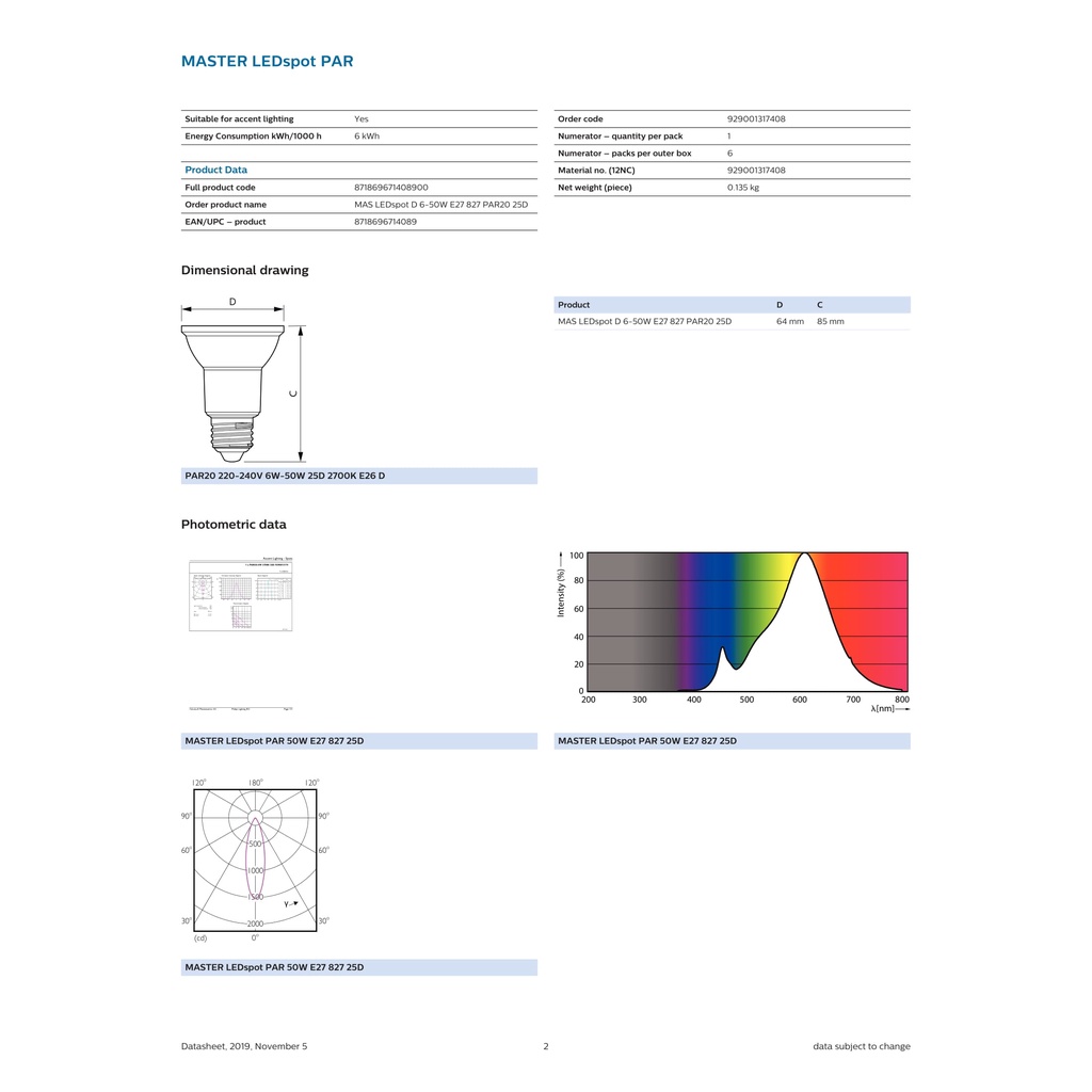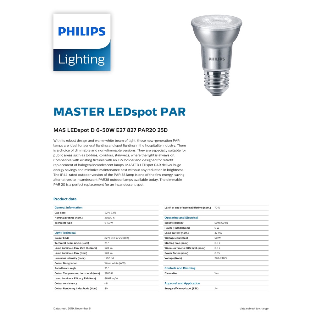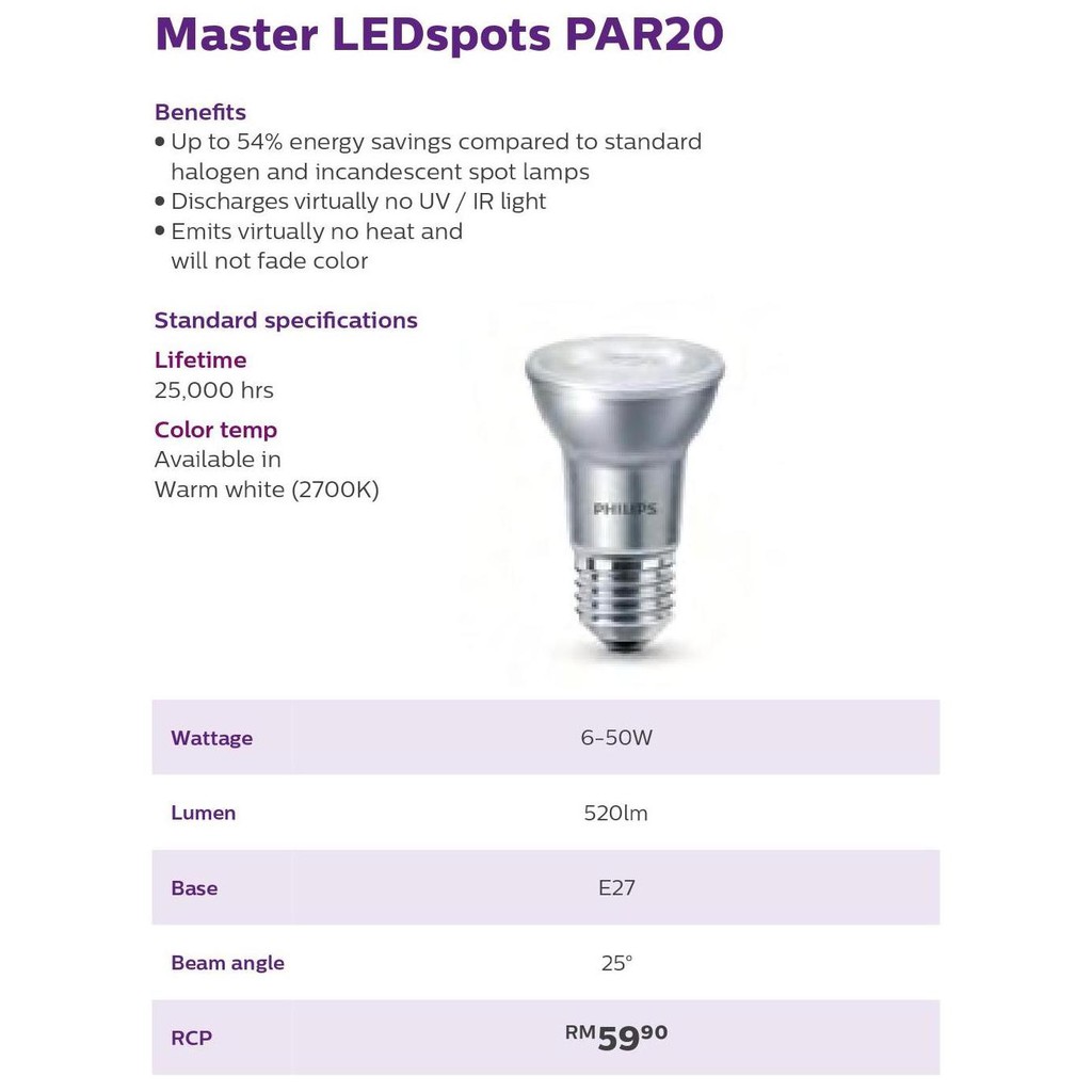 Philips Master LEDspot LED PAR Bulb PAR20 6W (Equivalent to 50W) E27 827 25D Dimmable