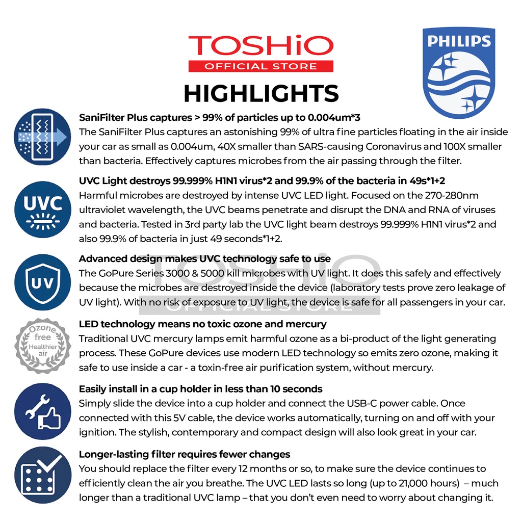 Philips Portable Car Air Purifier / Sanitizer GoPure Style Series 3000 (S3601/S3602) & 5000 (GP5611/GP5612/GP5613)