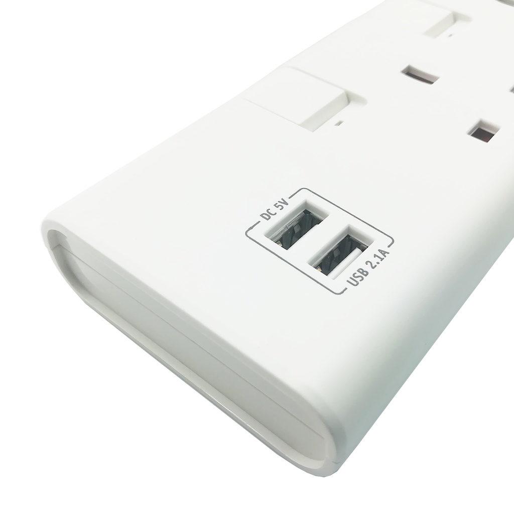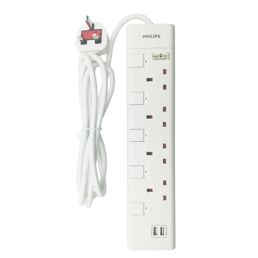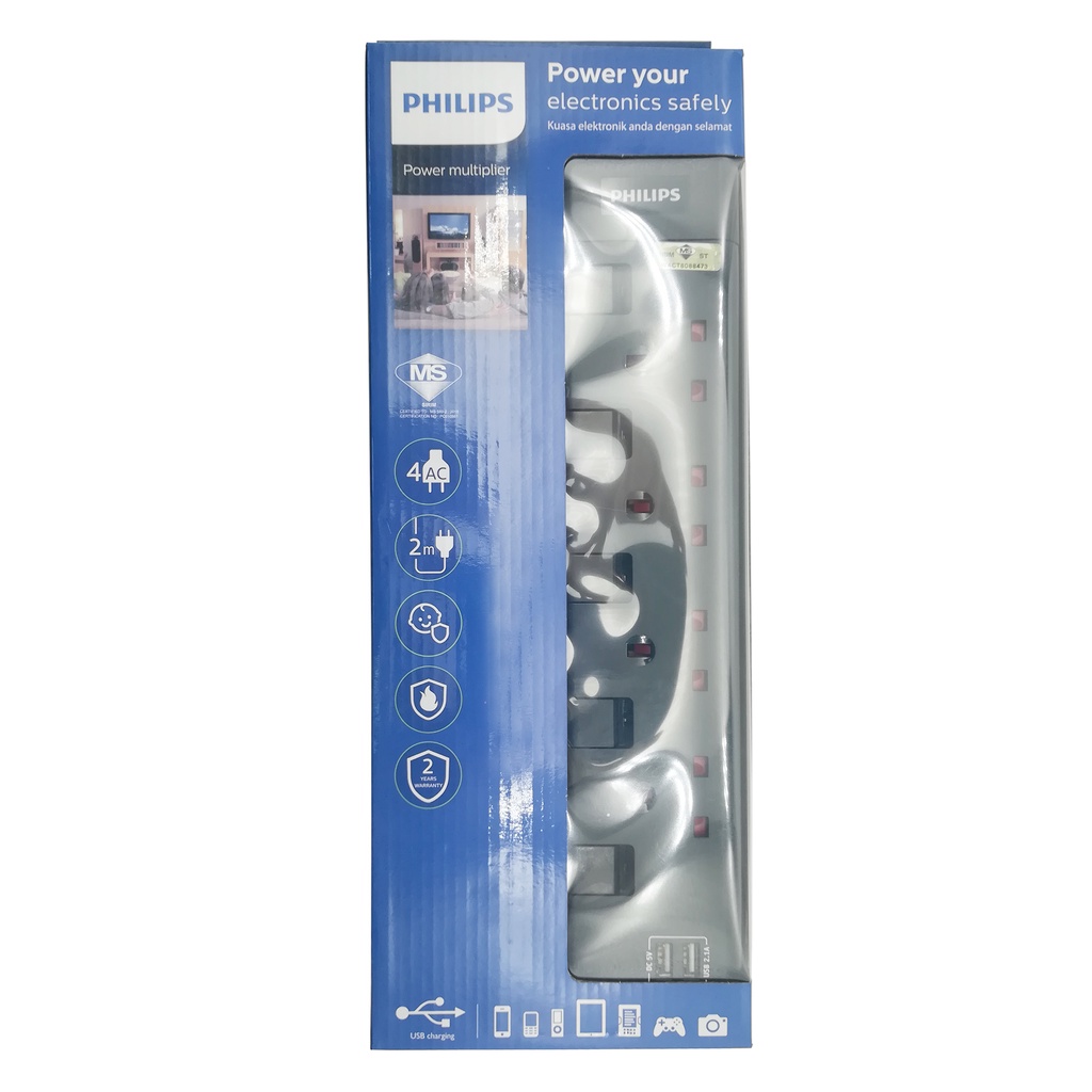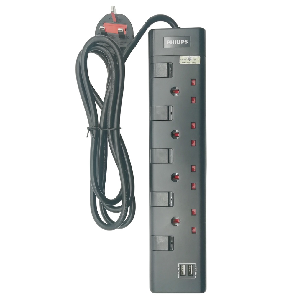 Philips SIRIM Approved 4 Way Extension Socket with 2 USB 2m Length Extension Plug Socket Strip USB Charger