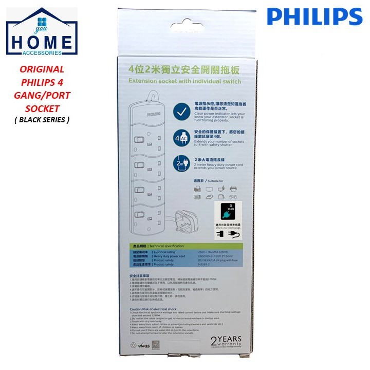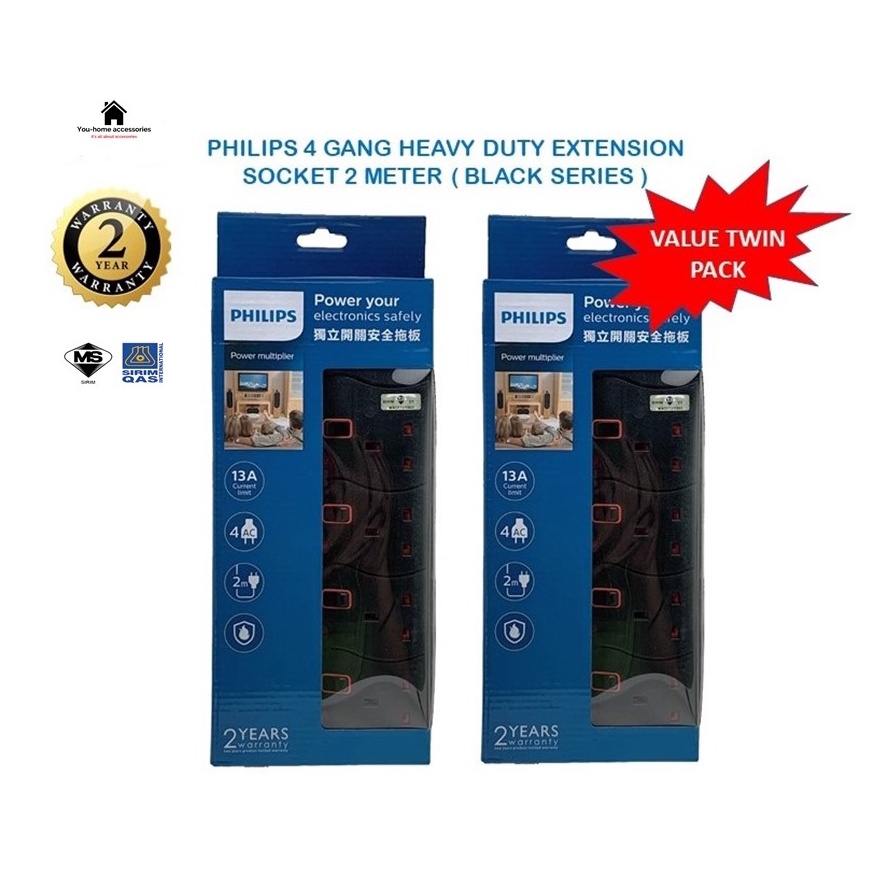 Philips Socket 4 Gang Extension Socket 2 Meter Black Series - Twin Offer Pack