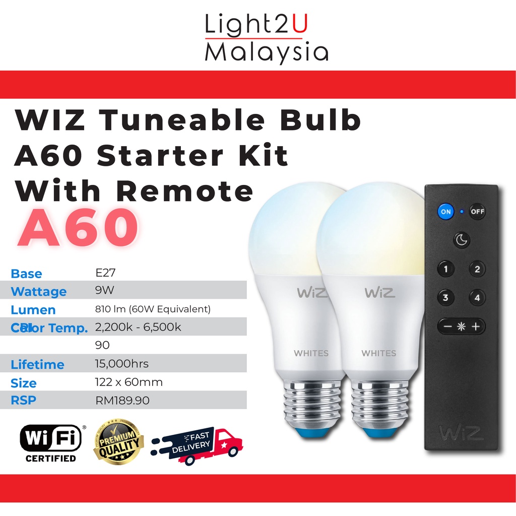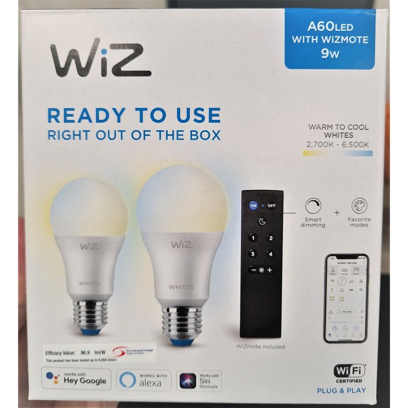 Philips WiZ E27 Smart Lighting Tunable White Bulb Starter Kit with WiZ Smart Lighting Remote Control (9W 2700-6500 K)