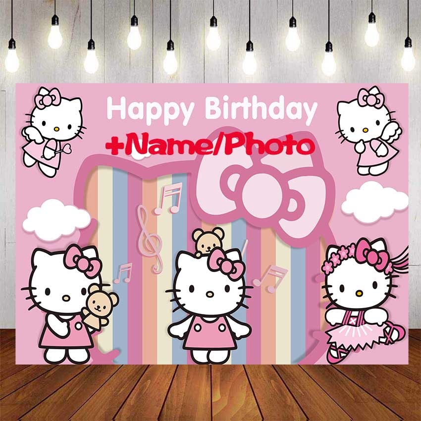 Pink Cute Hello Kitty Backdrop For Photography Baby Shower Kids Girls Big Kitty Head with Bow Background Birthday Party Decor Custom Name Photo
