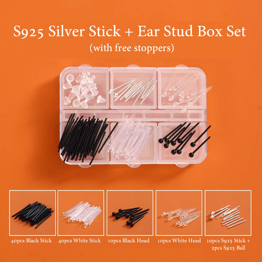 Plastic Hypoallergenic Ear Stick S925 Sterling Silver Ear Piercing Fine Ear Stud Pin Findings Earring Set (with box)