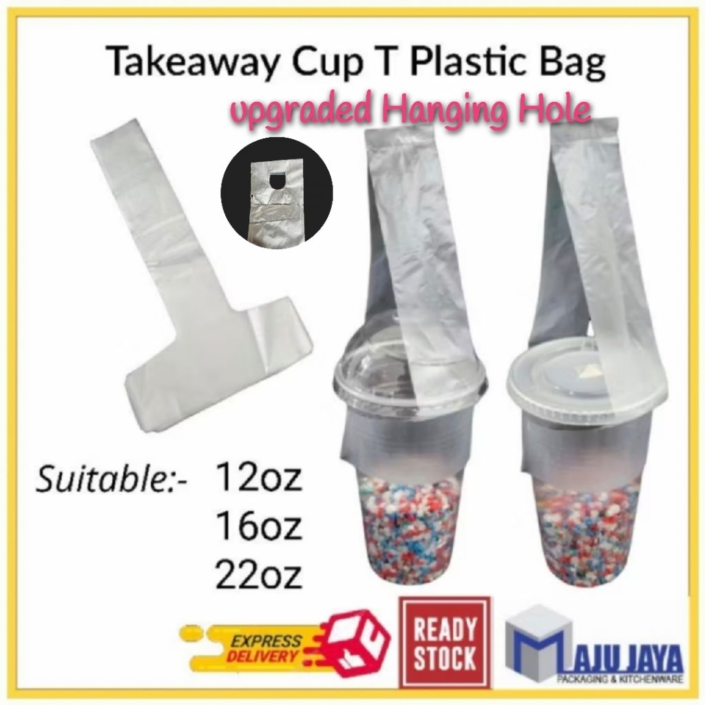 Plastik T Plastic Handle Cup T Bag / Takeaway Cup 12oz 16oz 22oz 100pcs+- Pemegang Cawan Gantung /Cup Holder [Maju Jaya]