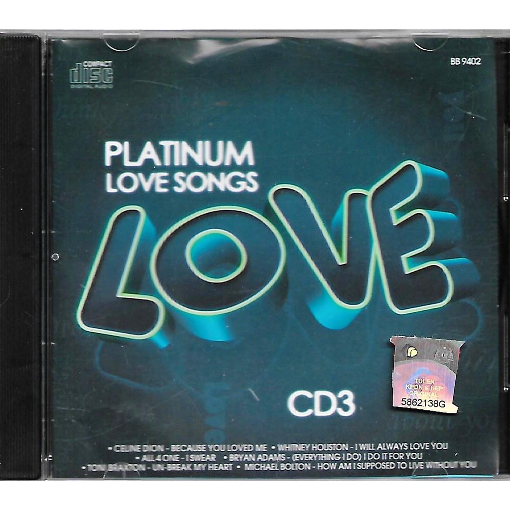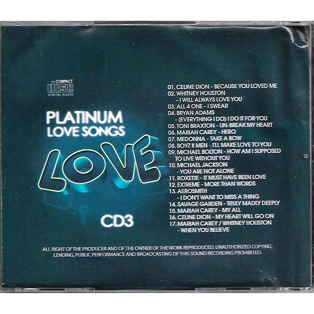 Platinum Love Songs CD 3 Original Artist Celine Dion Whitney Houston Bryan Adams Toni Braxton Mariah Carey Roxette