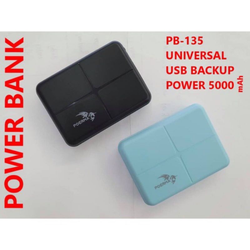 Poerma power bank 5000mAh MODEL: PB-135 Capacity : 5000mAh 3.7v Input : DC 5V/1.5A Output : DC 5V/1.5A -
