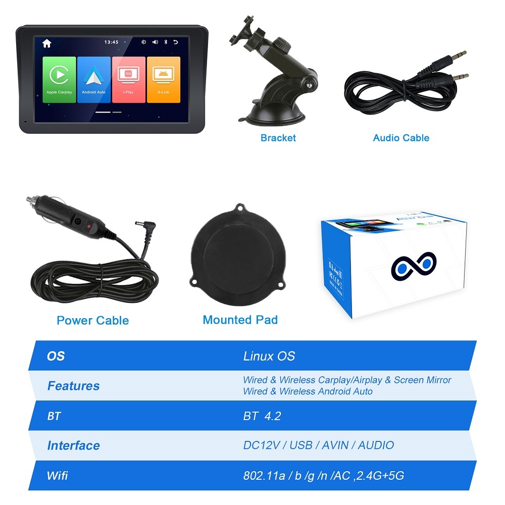 Portable 7 Inch Ips screen with wireless CarPlay and Android Auto Multimedia Player with Bluetooth, Mirror Link, Dash or Windshield Mounted easy installation