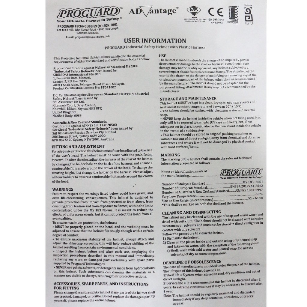 Proguard Industrial Safety Helmet Sirim Certified Yellow White Blue Red Orange Green Grey Purple Brown Topi Keselamatan