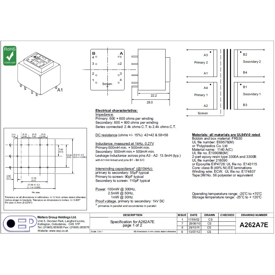 Promall OEP A262A7E TRANSFORMER AUDIO, Matching Transformer 600OHM - 600OHM