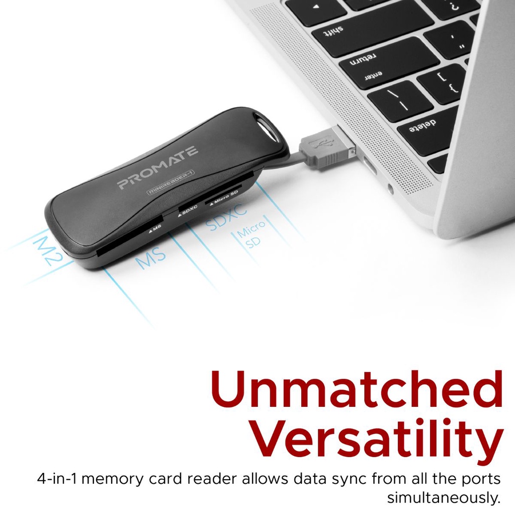 Promate MiniReader-1 4-in-1 Multimedia SD MicroSD Card Reader with 5Gbps Transfer Speed (SDXC, SDHC, SD, Micro SD)