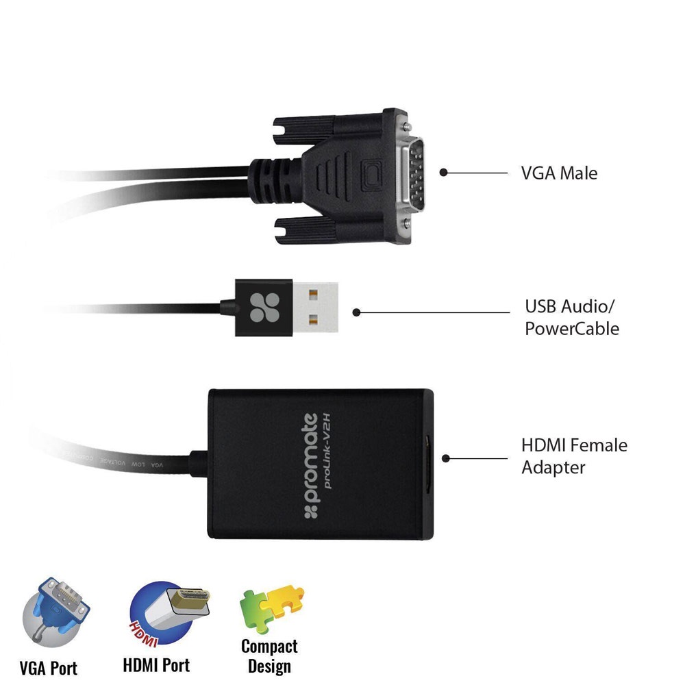 Promate VGA to HDMI Adapter Video Cable Converter Adapter Kit Plug and Play with Audio Support proLink-V2H