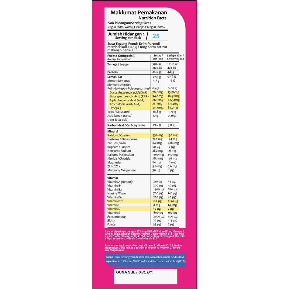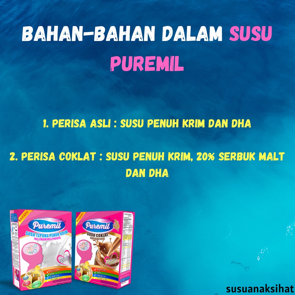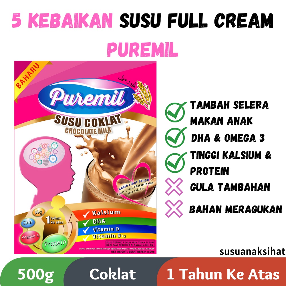 Puremil Susu Full Cream | Susu Asli & Susu Coklat | Susu Tanpa Gula Ditambah Dgn DHA & Omega 3 | Pengganti Susu Formula