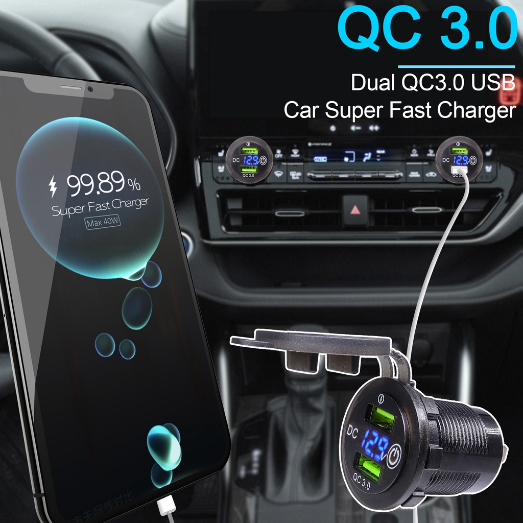 QC3.0 Wire Car Charger Socket Adapter Quick Charge Dual USB LED 36W 12V/24 Fast Charging Outlet Voltmeter Switch Motorcycle ATV Boat Truck Auto