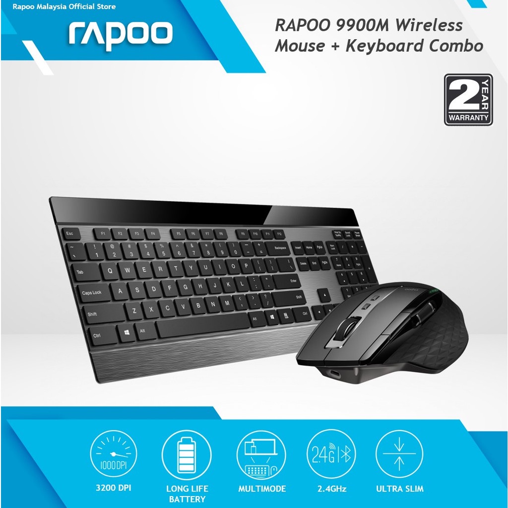 Rapoo 9900M Ultra Slim Silent Multi-Mode 2.4GHz Wireless Mouse Bluetooth Mouse and Keyboard Combo - 3 Years Warranty