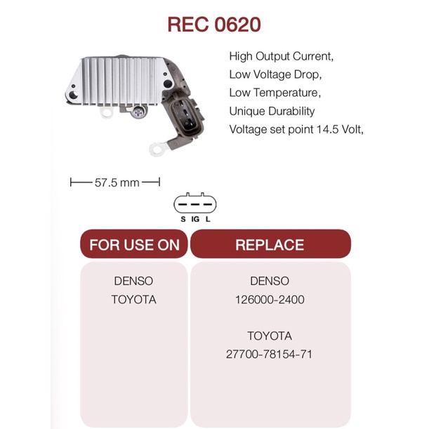 REC0620 BRAND REC ALTERNATOR IC REGULATOR 12V 3PIN (NIPPON DENSO TYPE) FOR USE ON: DAIHATSU DV99, TOYOTA FORKLIFT