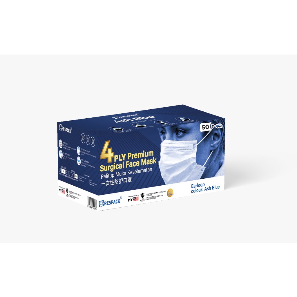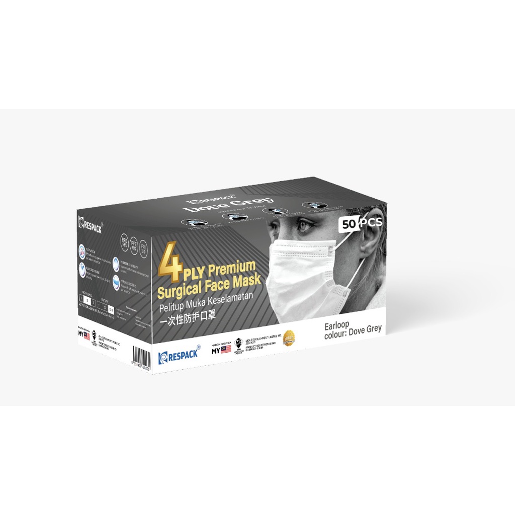 RESPACK Medicare 4PLY Premium Earloop Surgical Face Mask Ash Blue/Dove Grey/Pearl White/Jade Black 50's/BOX