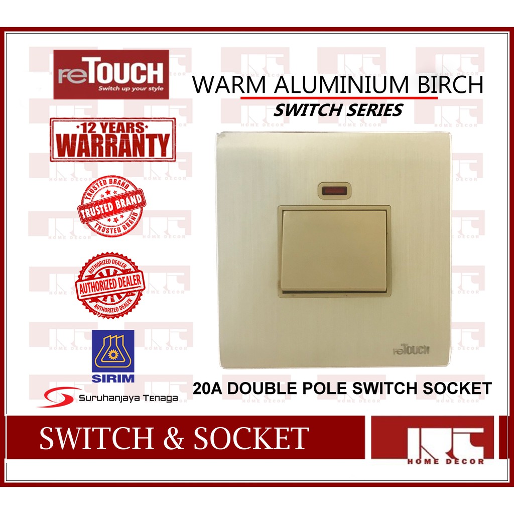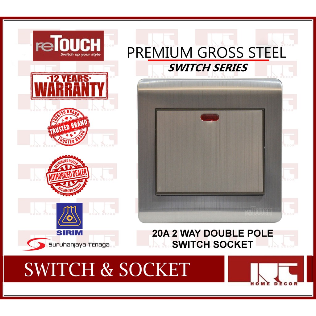 RETOUCH PREMIUM / WARM 20A DOUBLE POLE SWITCH WITH NEON FRAMELESS SWITCH / GROSS STEEL / ALUMINIUM BIRCH