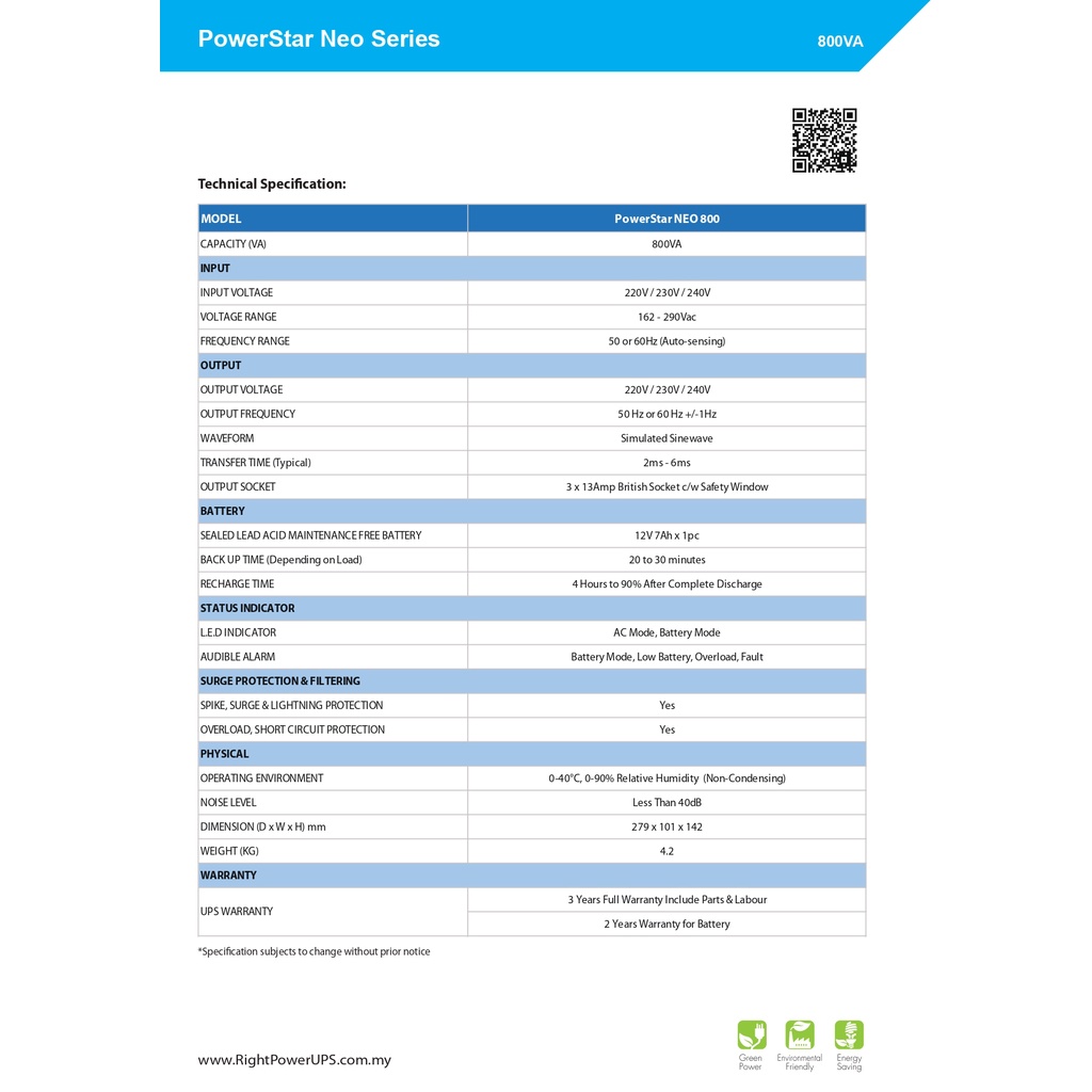 RIGHT POWER UPS 800VA (POWERSTAR NEO 800) AVR AVS AUTOMATIC VOLTAGE STABILIZER REGULATOR WITH 3 UK OUTPUT