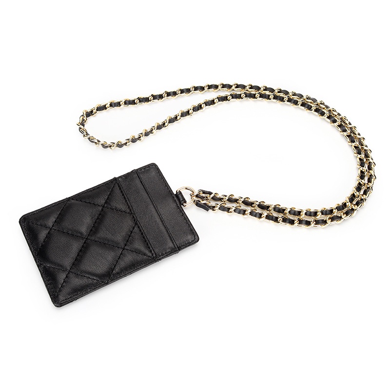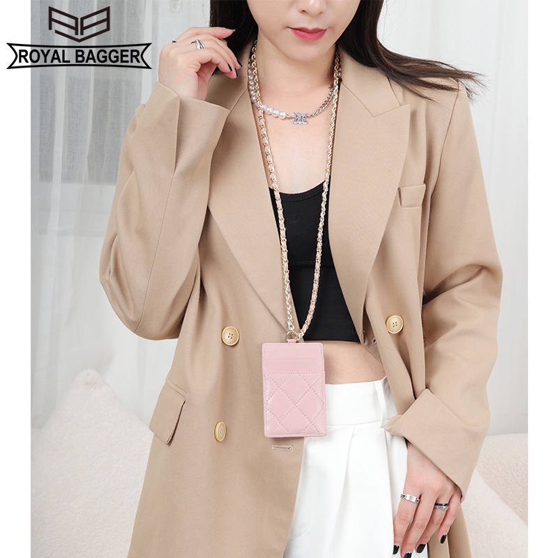ROYAL BAGGER Sheepskin Card Holder Lady Genuine Leather Hanging Neck Fashion Chain Strap Women Thin Work ID Cards Holders Purse