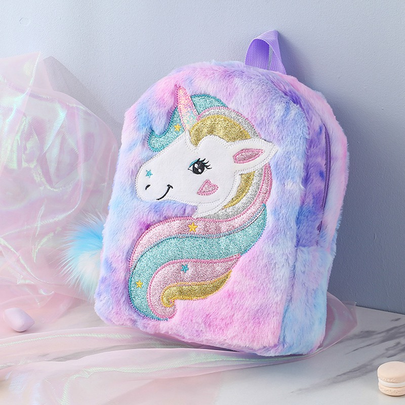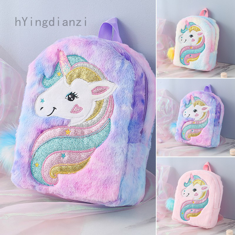Rainbow Fluffy Unicorn Backpack Plush Back To School Rucksack Zipper Bag