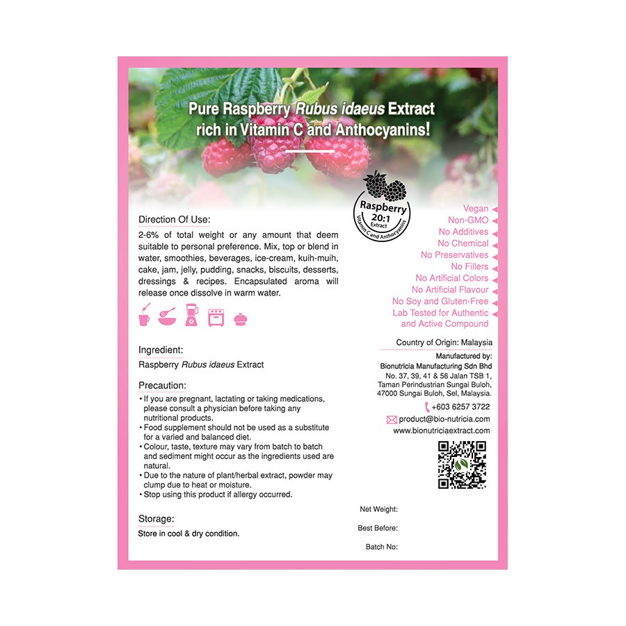 Bionutricia Raspberry (Rubus idaeus) Standardized Extract Powder 100g