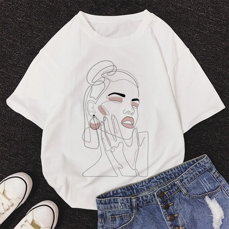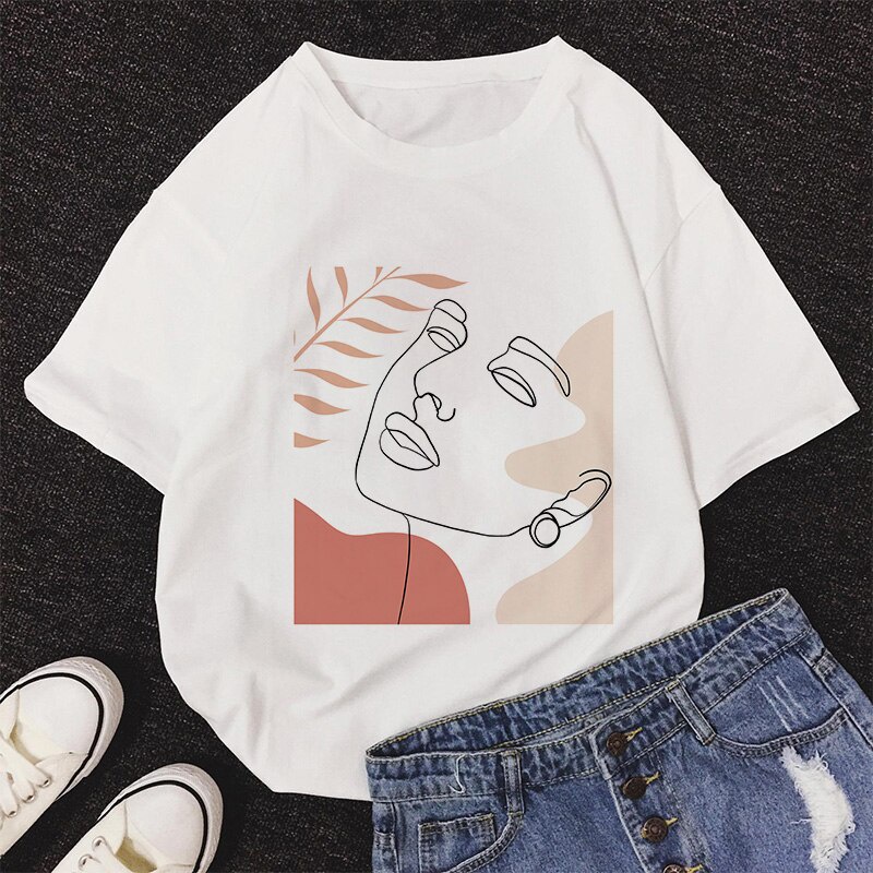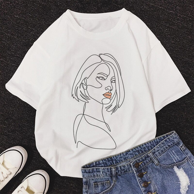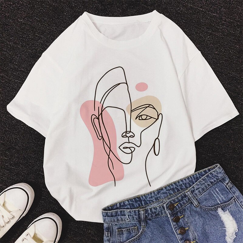 Ready Stock❤ INS Line Faces Graphic Print T-shirt Women Tee Harajuku Aesthetic White Top Casual Tshirt kp114 Women's top