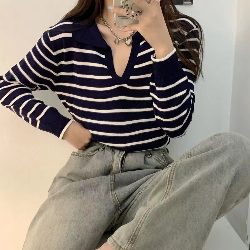 Ready Stock Korean Baju Blouse Atasan Kerah Rajut Wanita Kaos Berkerah Polo V Neck Tali Serut Style Korea Knitted Top