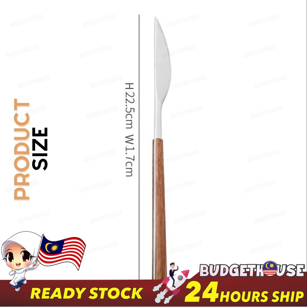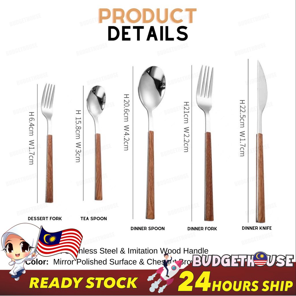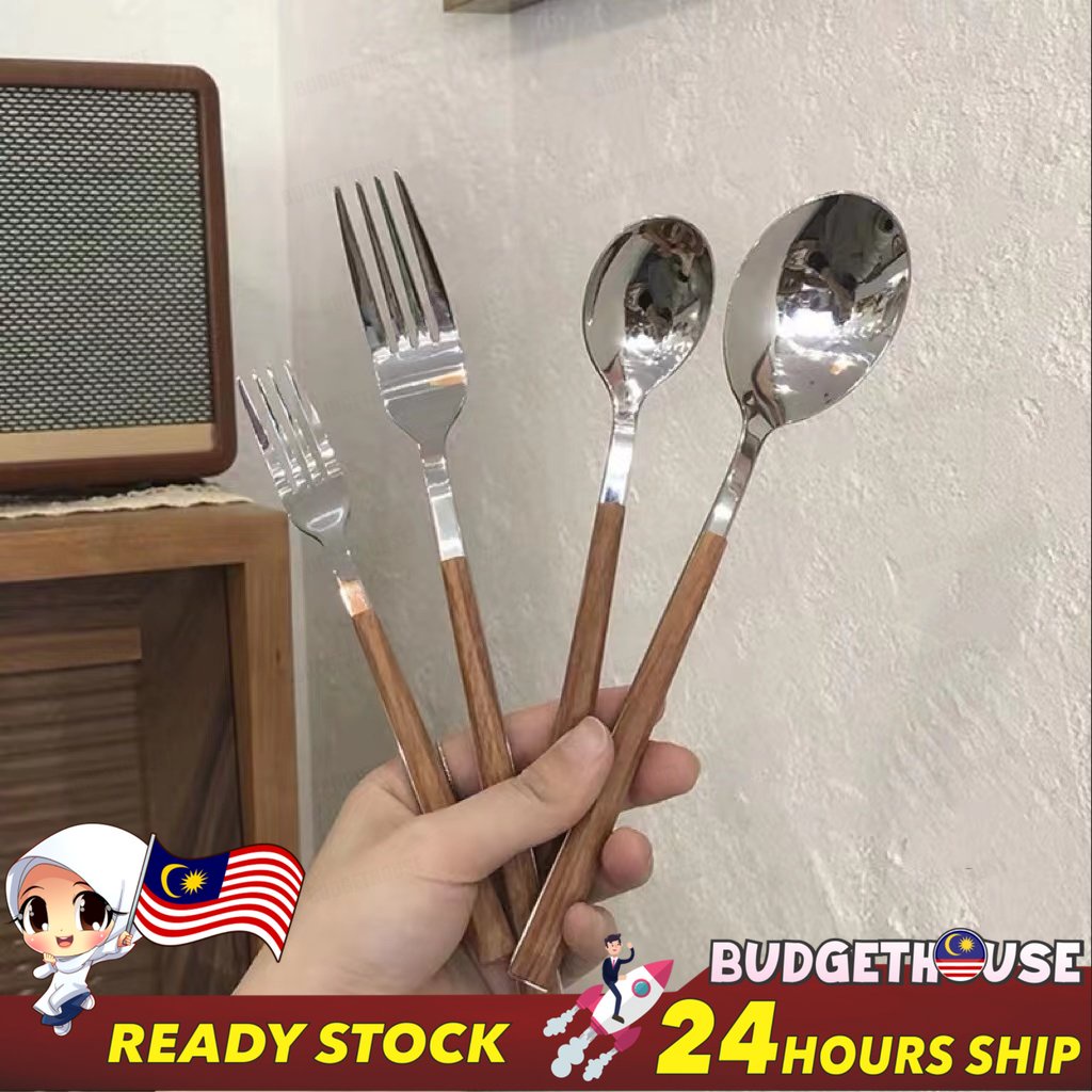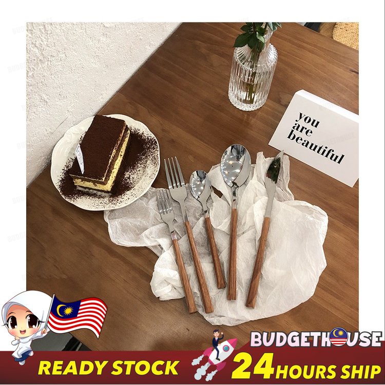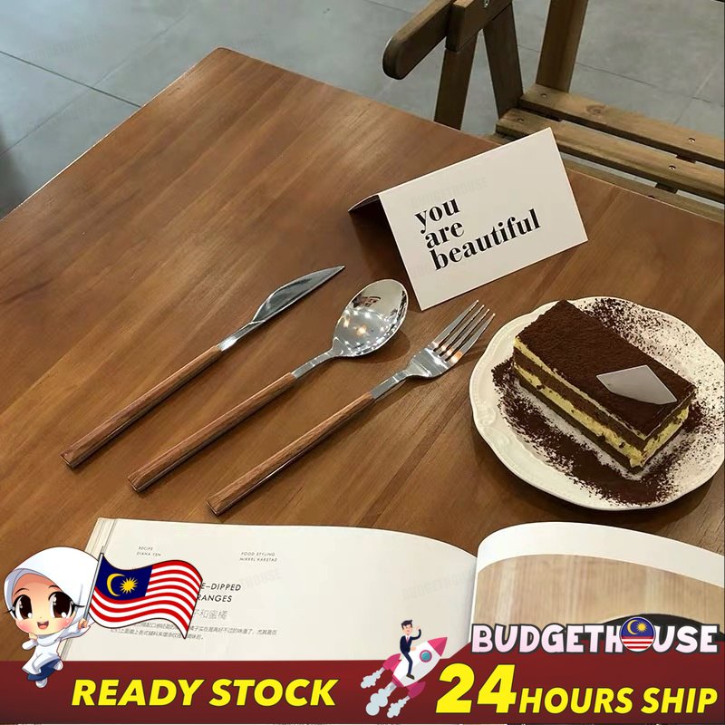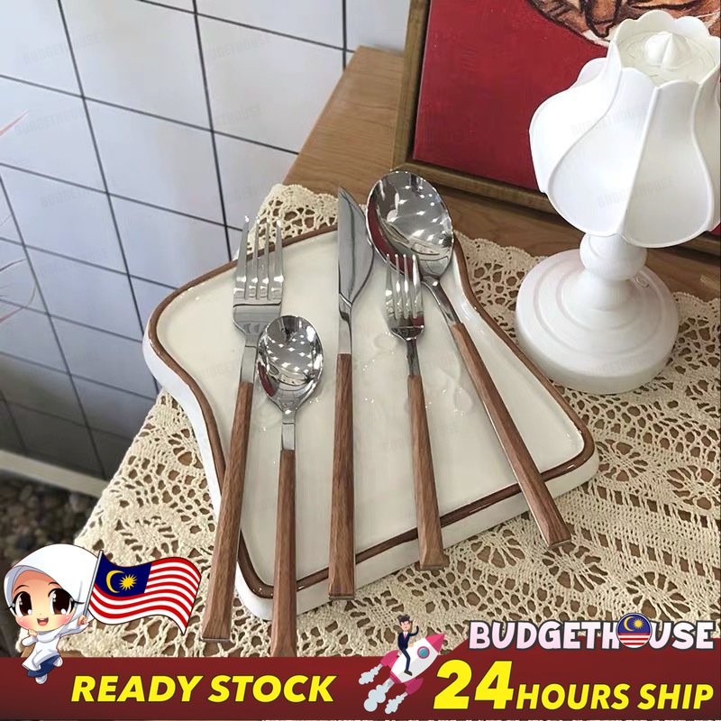 Ready Stock Stainless Steel Cutlery Imitation Wooden Handle Western Steak Knife Spoon Fork Gift Tea Spoon Dessert Fork