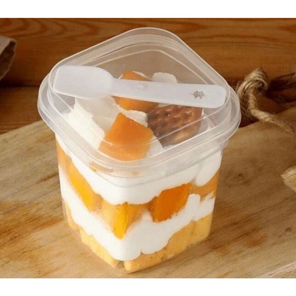 Ready stock!! 260 ML With Spoon Transparent Plastic Mousse Cup Square Food Cups for Jelly Mousse Desserts Yogurt Pudding