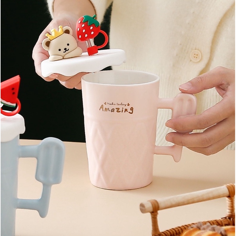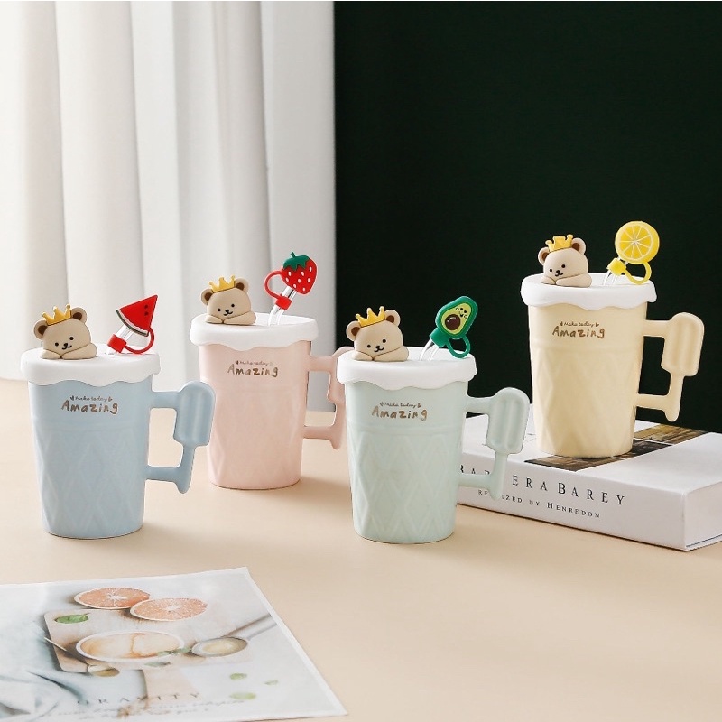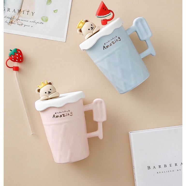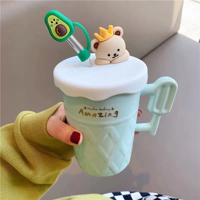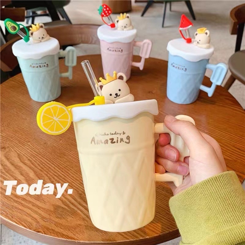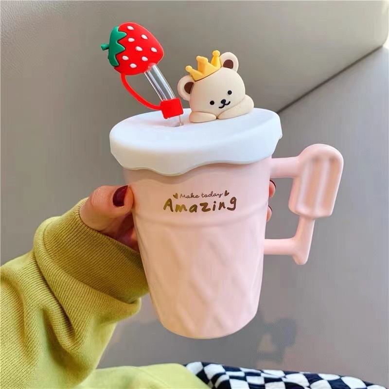 Ready stock!! New creative cute ceramic cup with lid and glass straw water