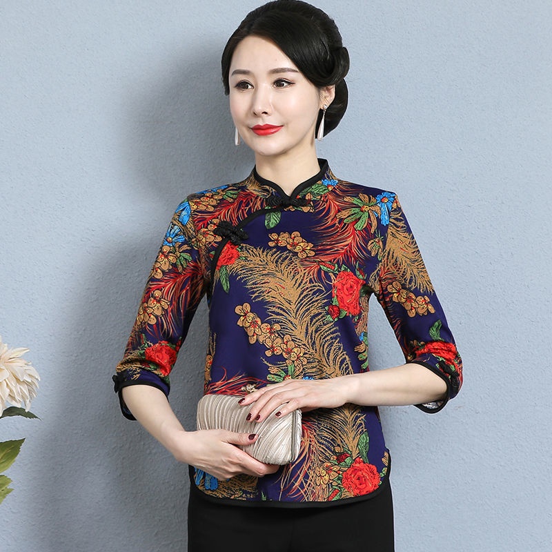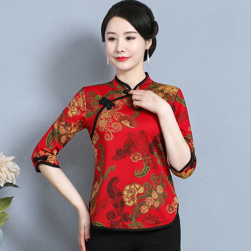 Ready stock autumn Baju Kurung short sleeve cheongsam mother shirt cover bottoming shirt Chinese style middle-aged women