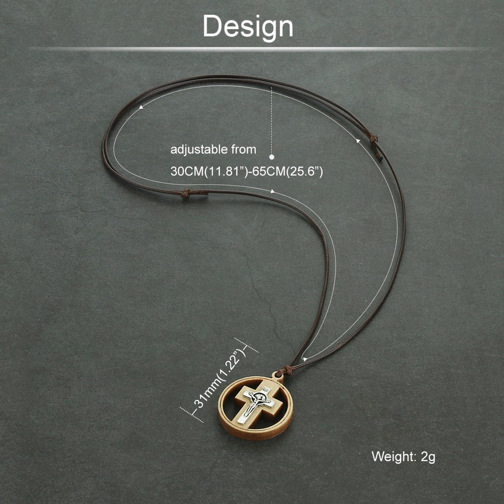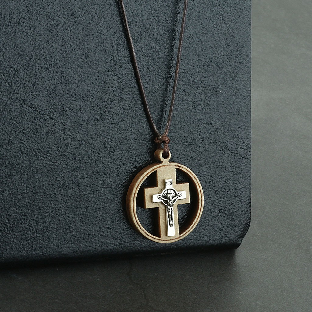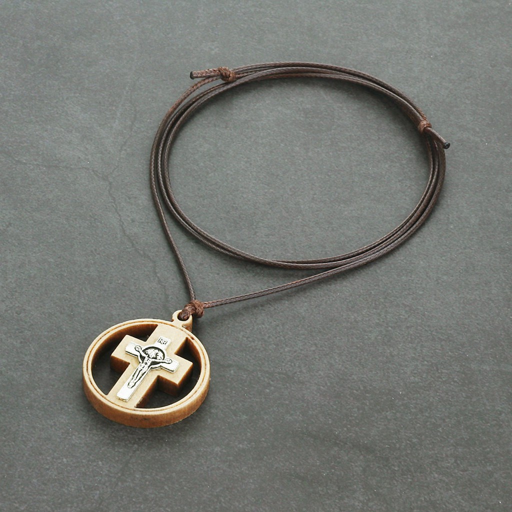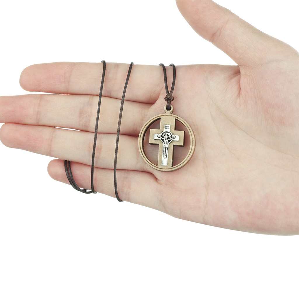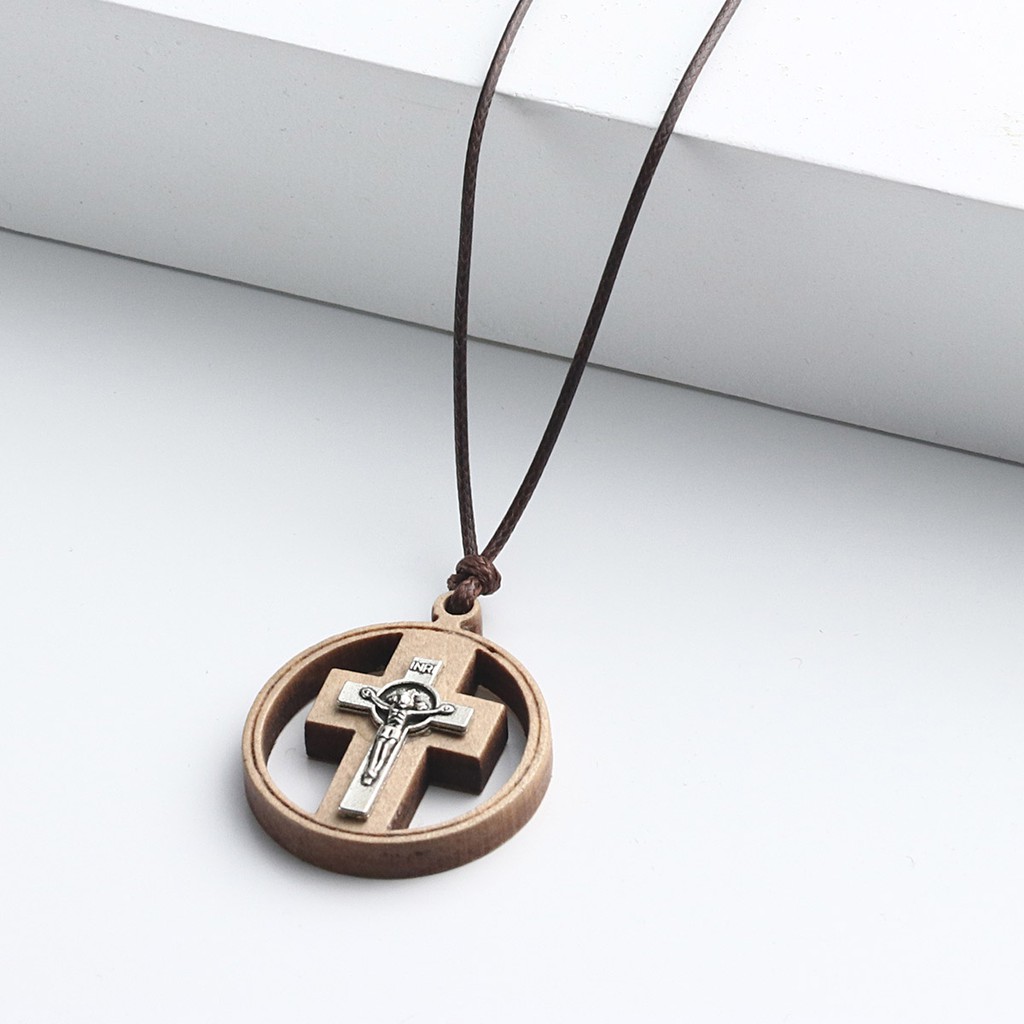 Religous Christian Catholic Crucifix Jesus Round Circle Wooden Cross Pendant Necklace
