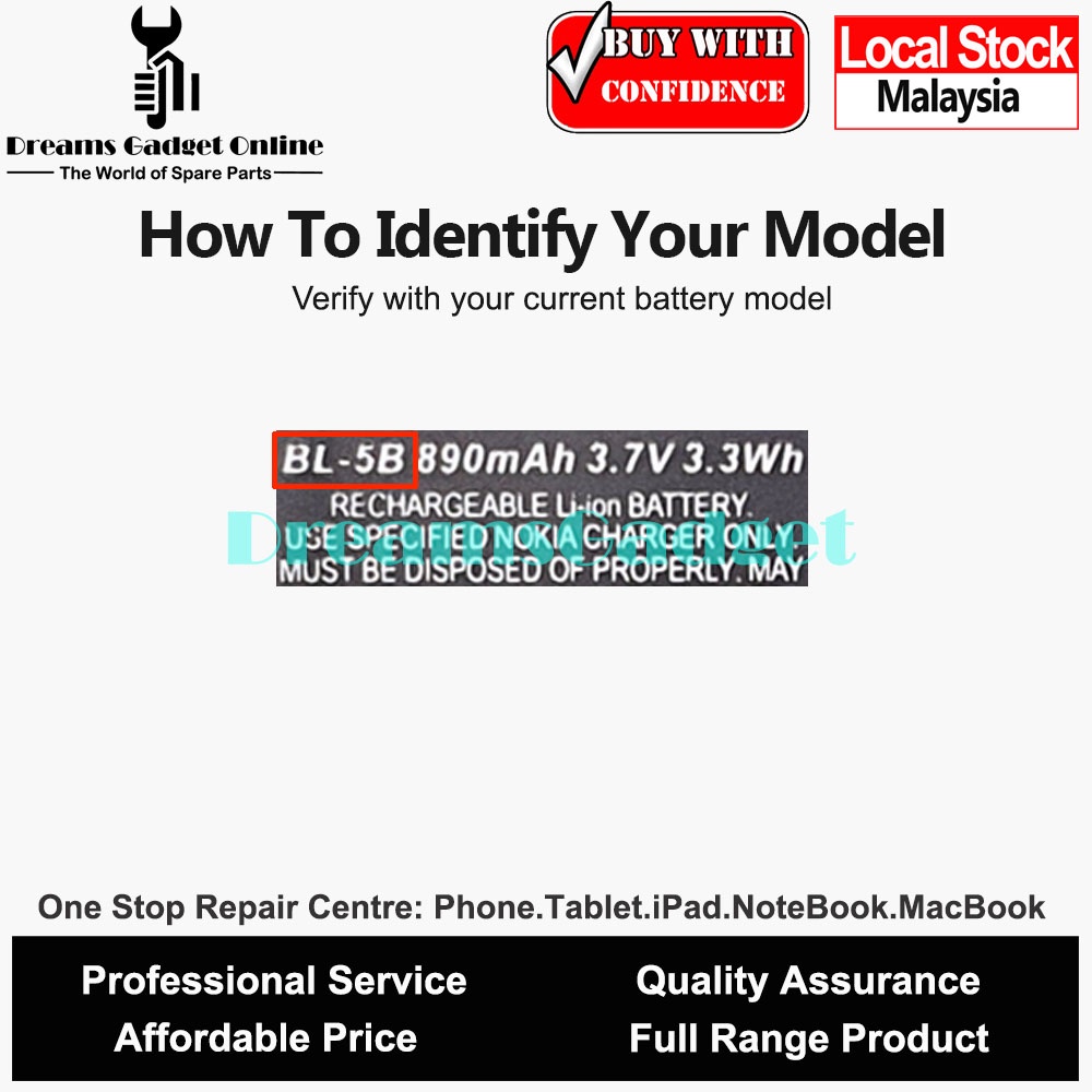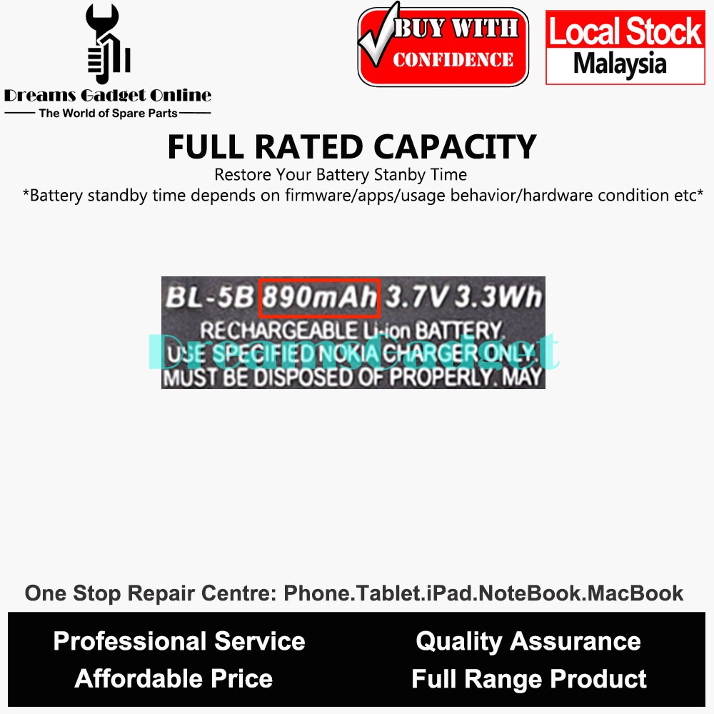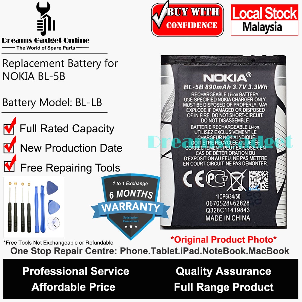 Replacement Phone Nokia Battery BL-5B BL5B Full Rated Capacity 890 mAh FREE Repairing Toolkit